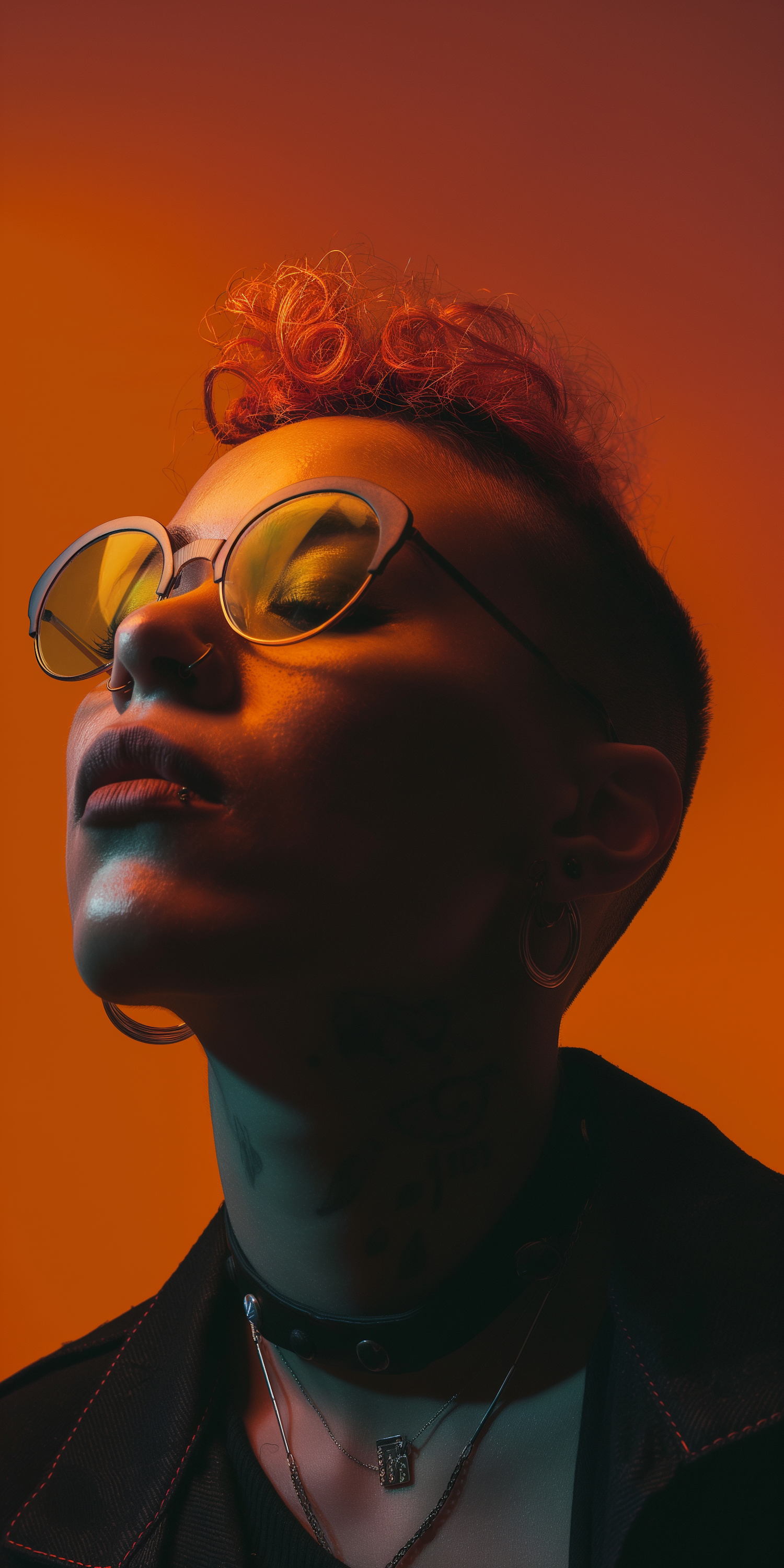 Edgy portrait of a person with red hair, sunglasses, and tattoos, set against a warm orange background.