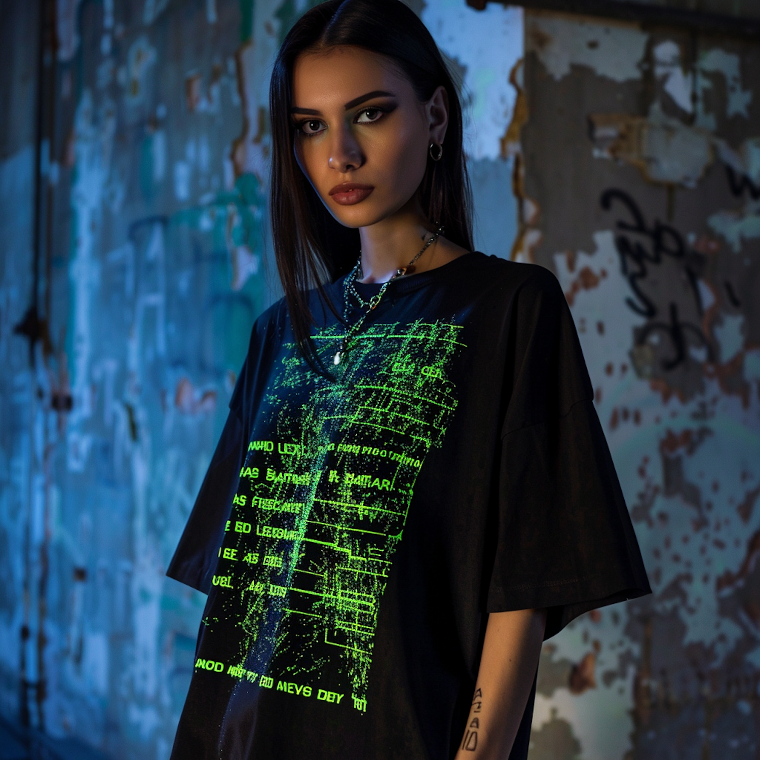 Young woman with dark hair in a black t-shirt with green graphics, standing against a textured urban wall with graffiti.