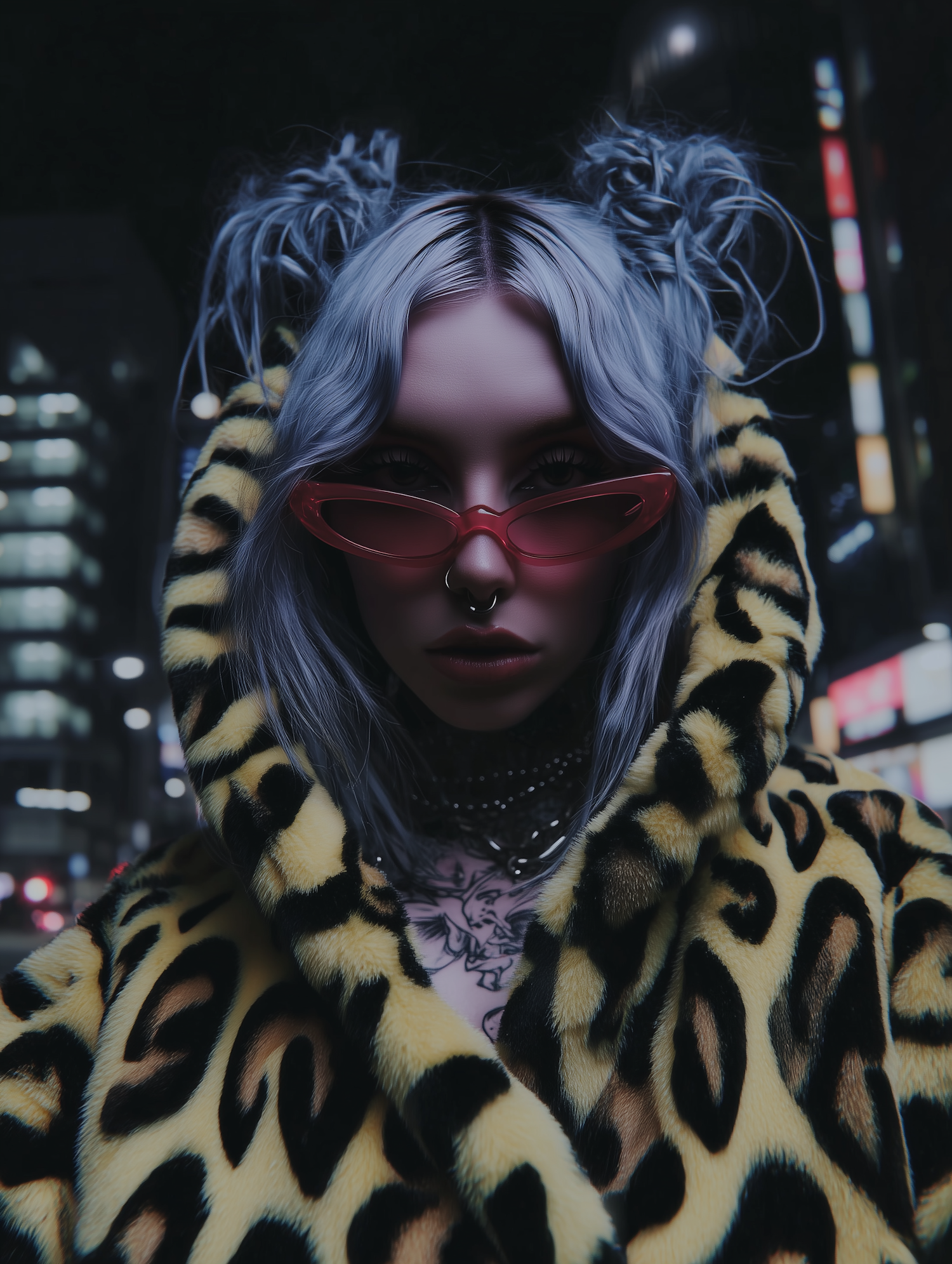 Stylish individual with blue hair, leopard-print coat, and red sunglasses in a vibrant urban night setting.