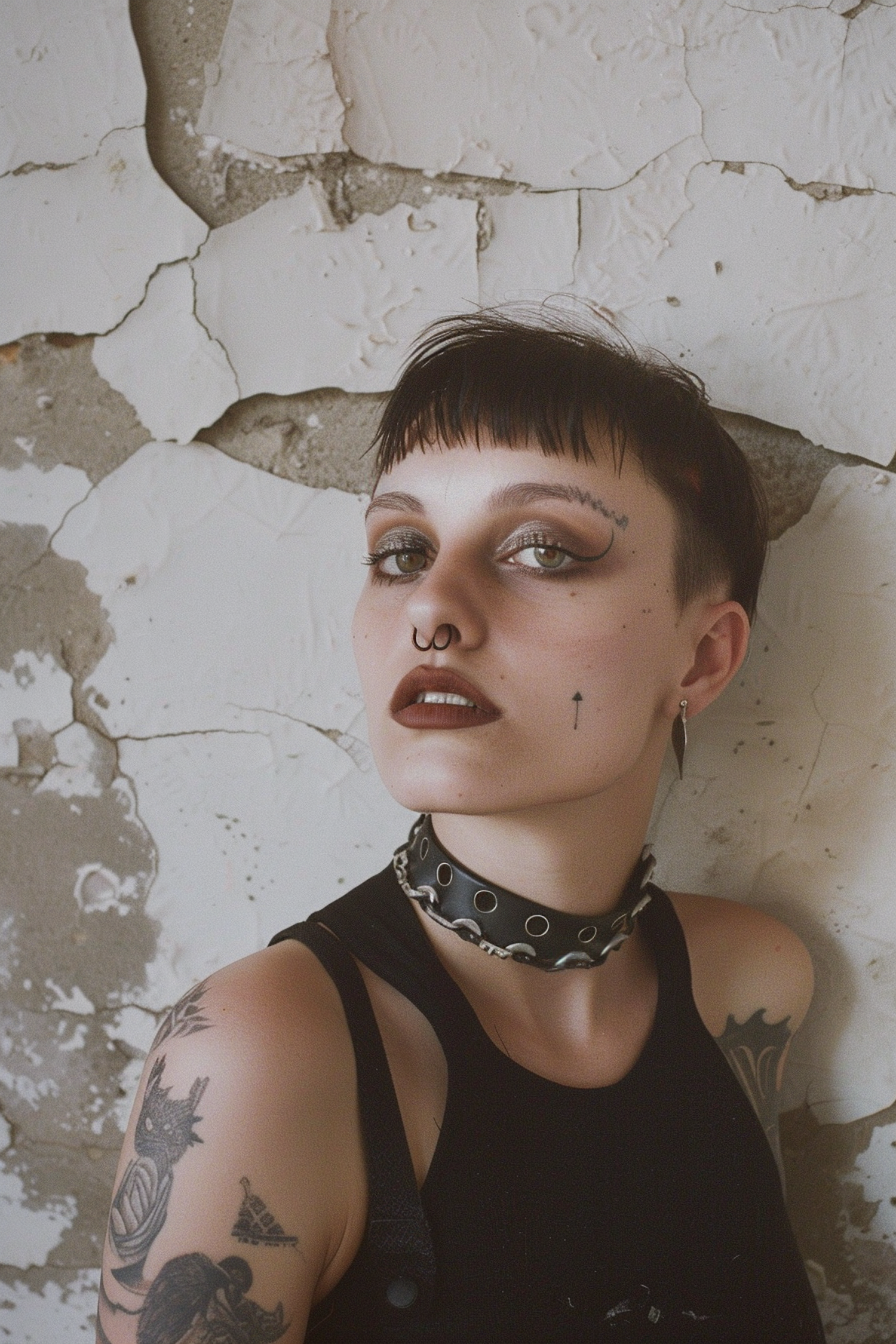 Edgy portrait of a woman with tattoos, piercings, and bold makeup against a cracked wall. Dark hair, choker, and confident expression.