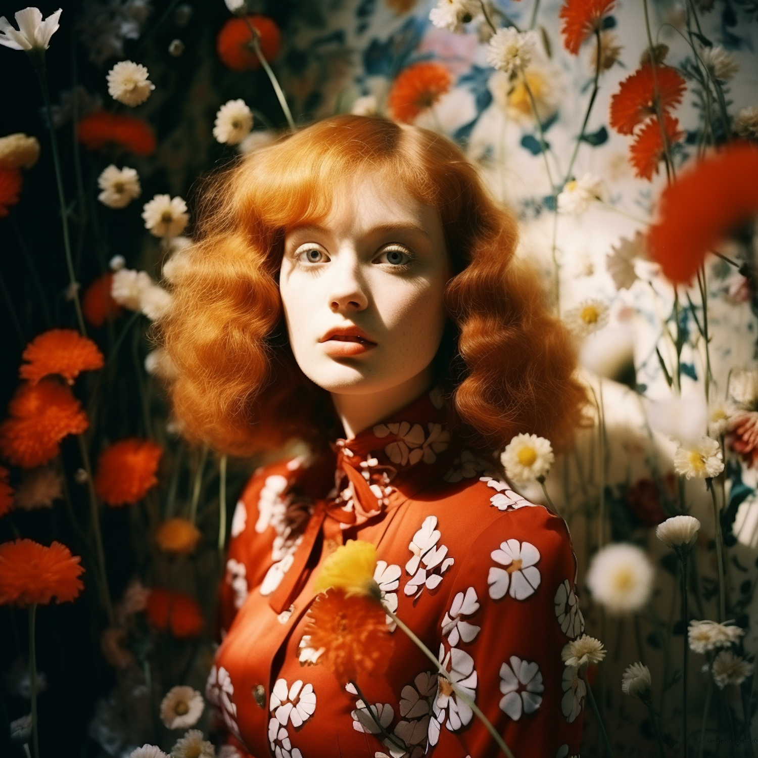 A red-haired woman in a floral dress stands among vibrant flowers, creating a harmonious and colorful scene.