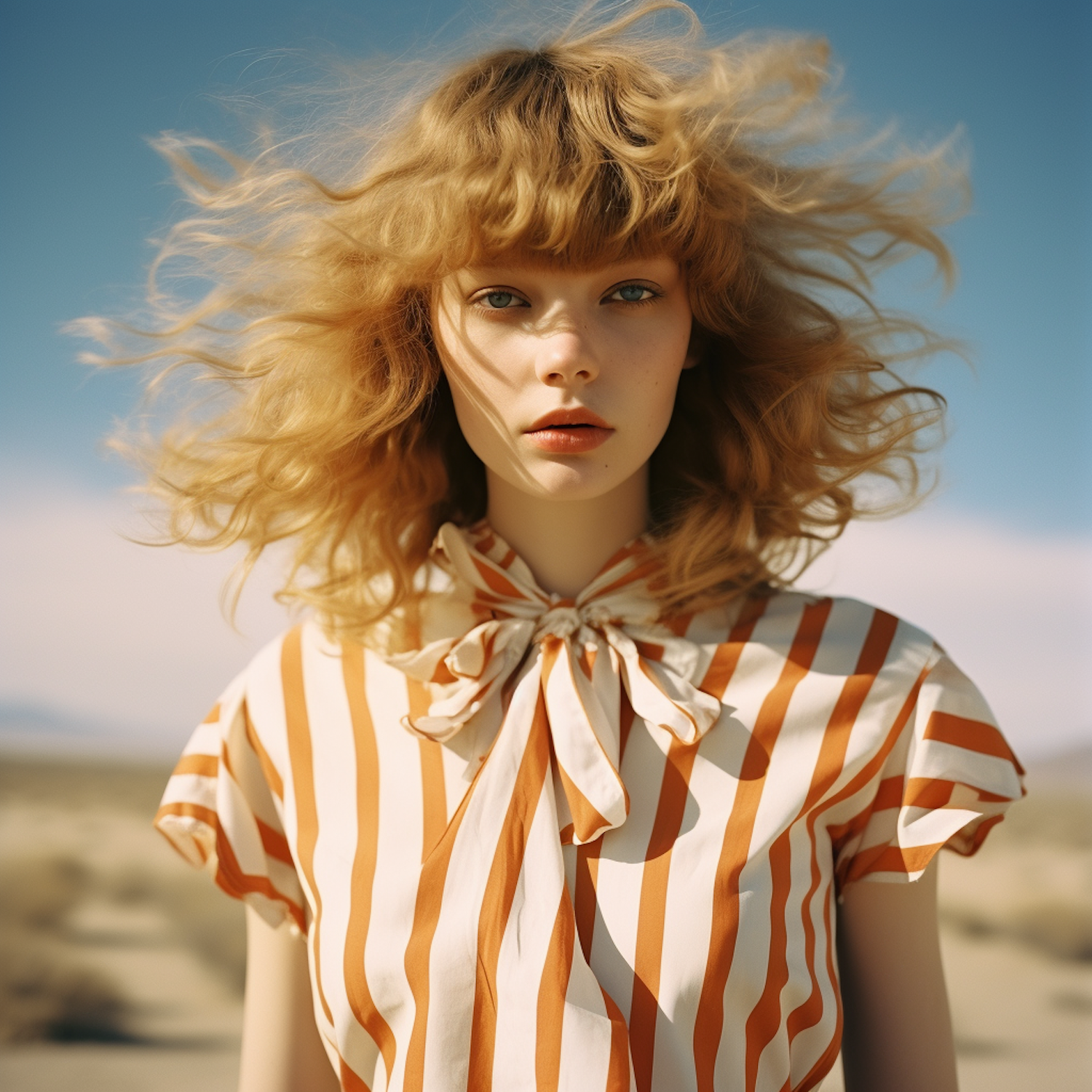 Blonde woman in striped blouse stands in a windy desert, her hair flowing against a clear blue sky.