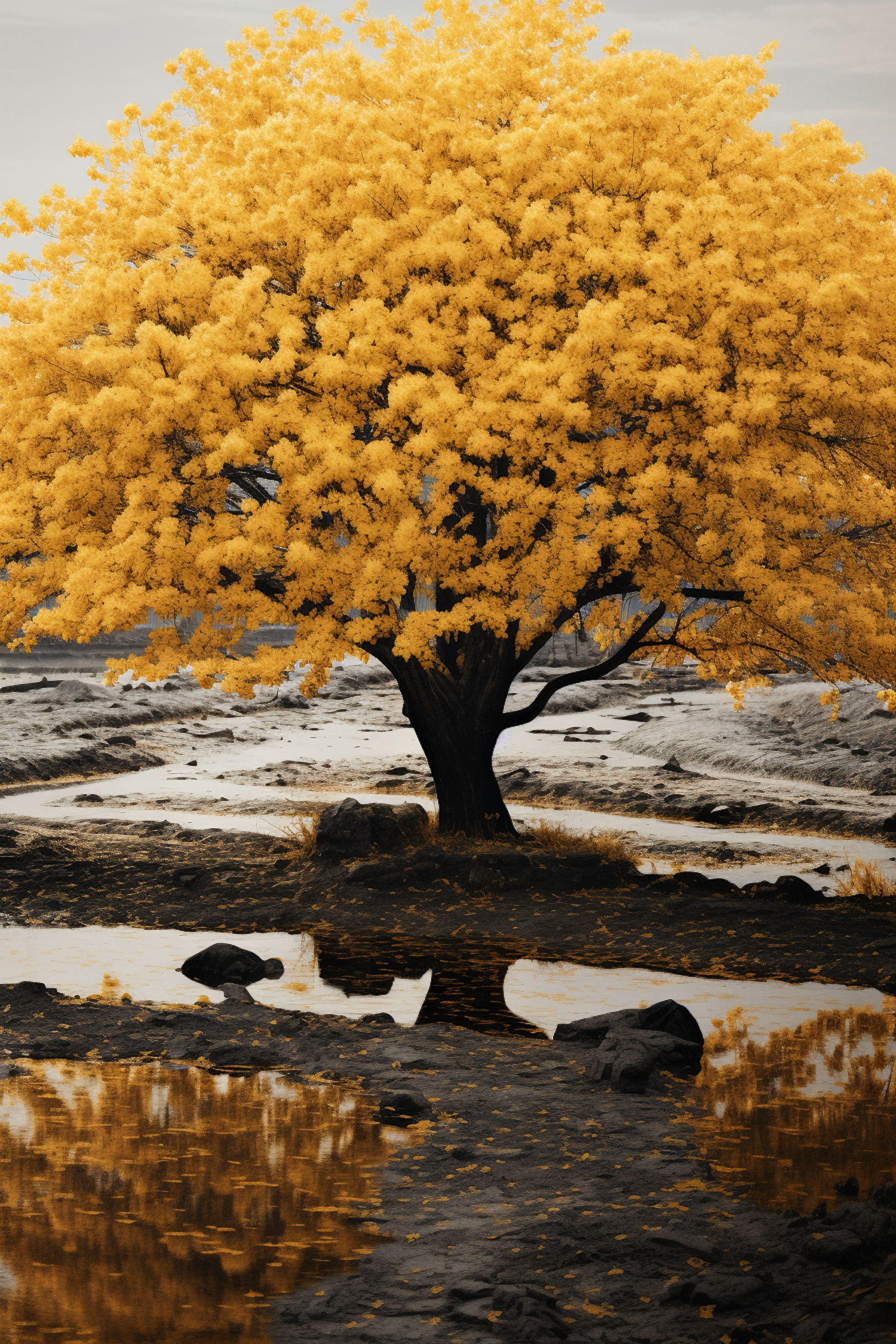 A vibrant yellow-leaved tree stands in a barren landscape, reflecting in shallow pools. Overcast sky enhances the serene, natural beauty.