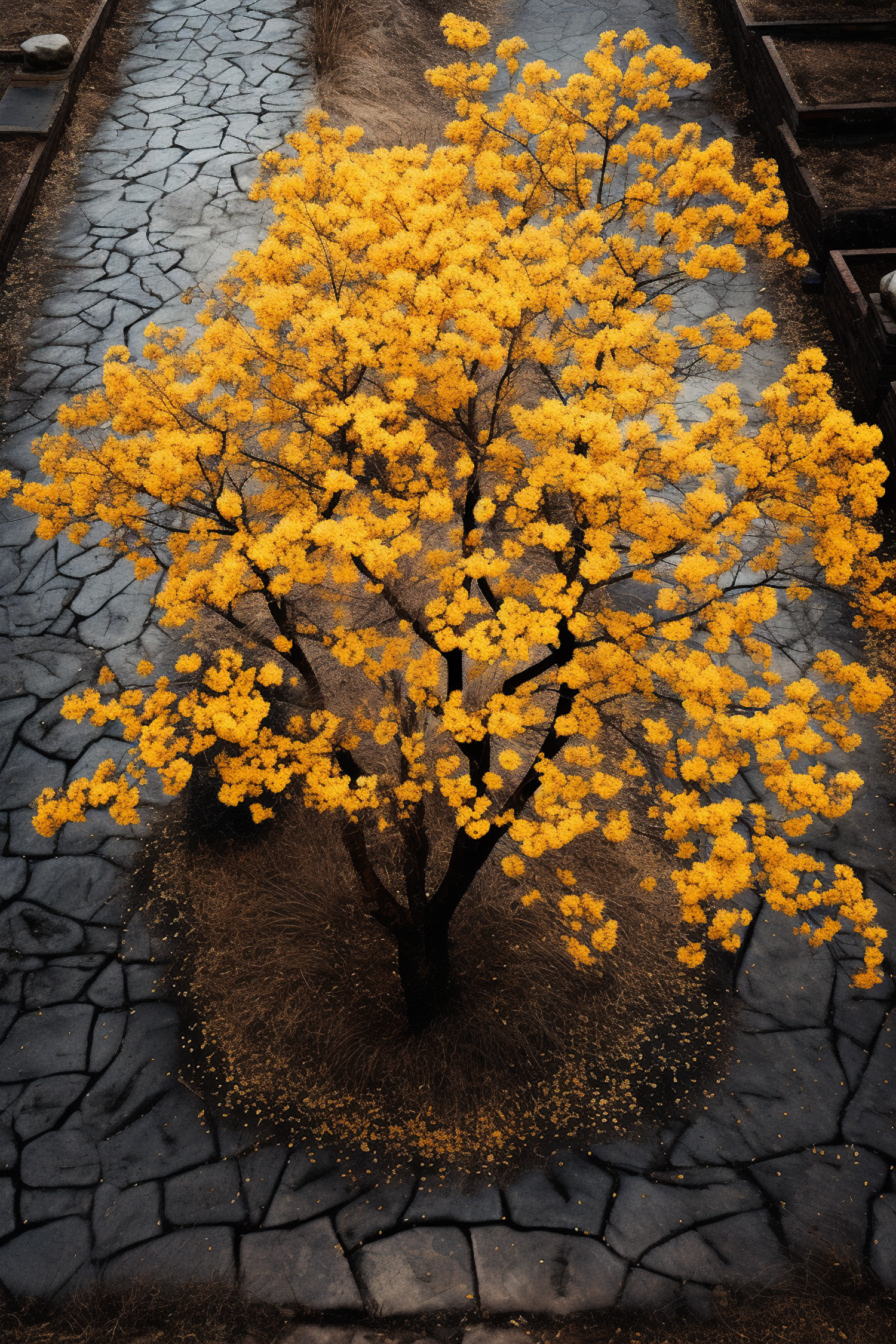 A vibrant yellow tree in full bloom stands on a cracked stone pathway, creating a striking contrast with its surroundings.