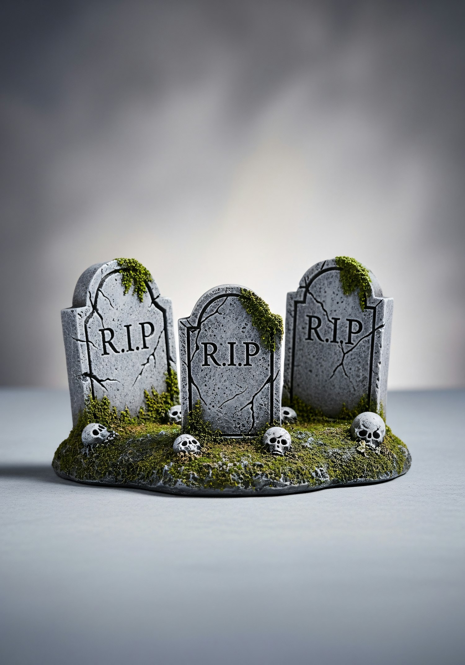 Three aged gravestones with 'R.I.P.' inscriptions, surrounded by moss and skulls, create a spooky and atmospheric scene.