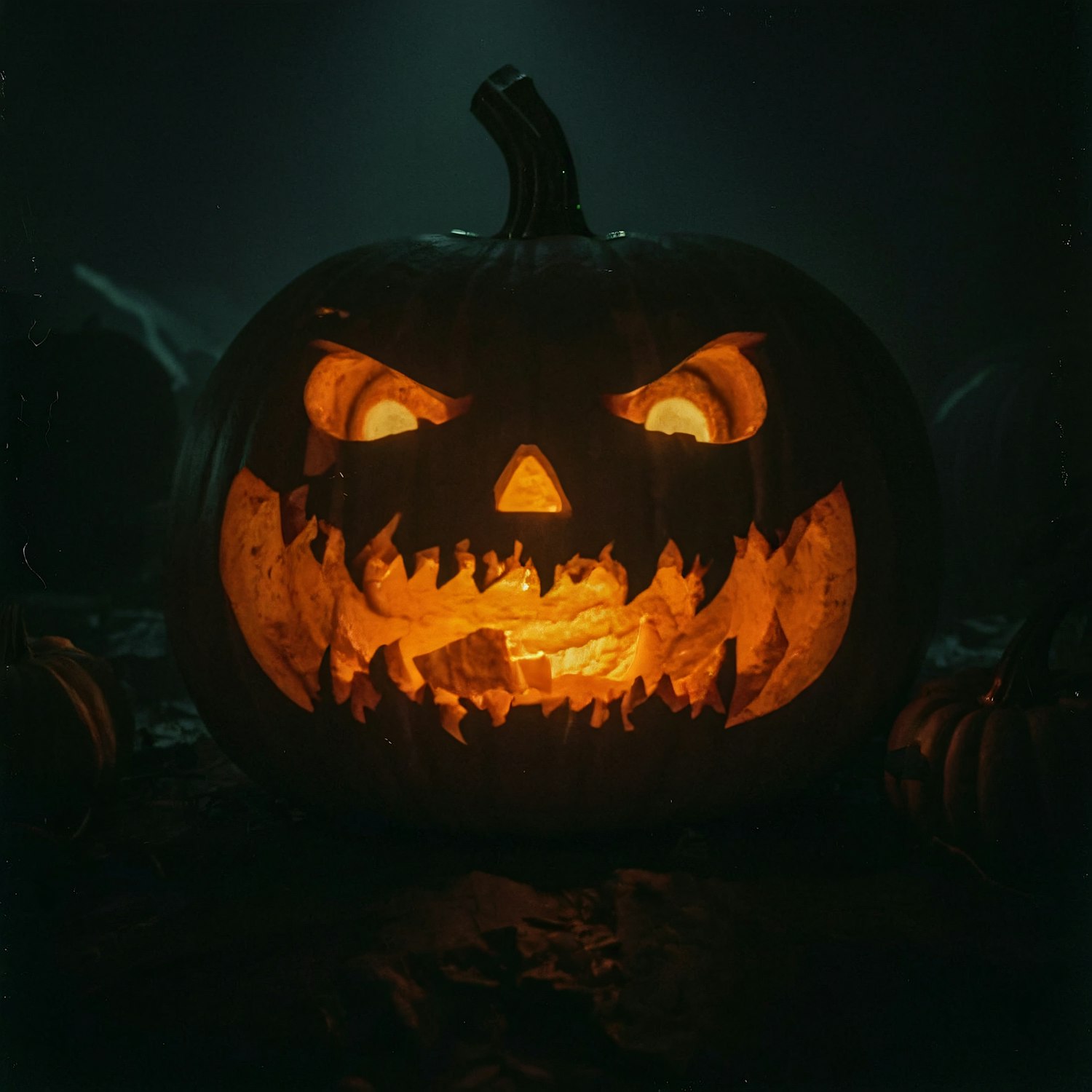 A spooky carved pumpkin with glowing eyes and jagged teeth, set in a dark, eerie atmosphere perfect for Halloween.