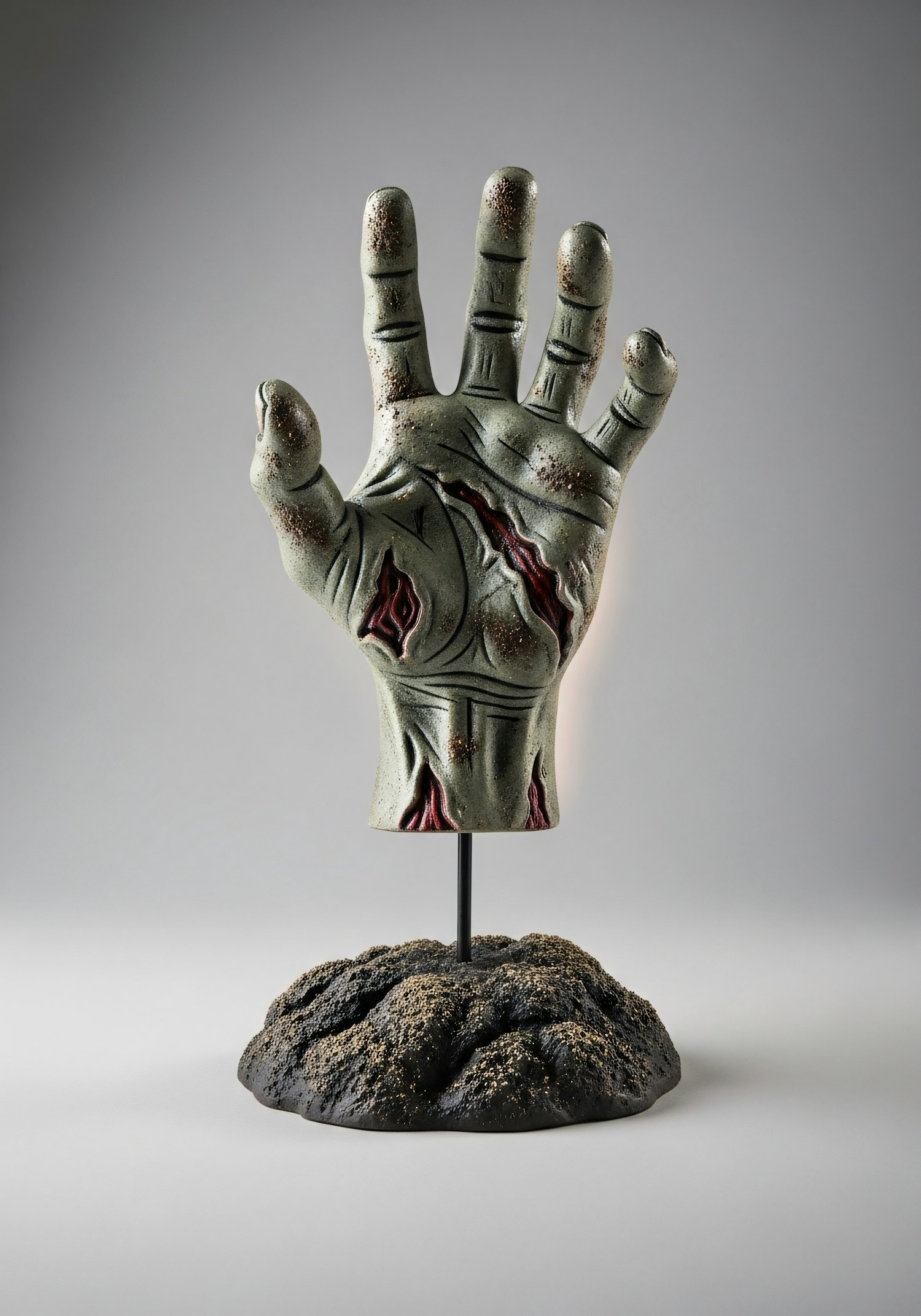 A detailed sculpture of a weathered hand with eerie carvings and gashes, mounted on a rugged base, evoking a mysterious and macabre aesthetic.