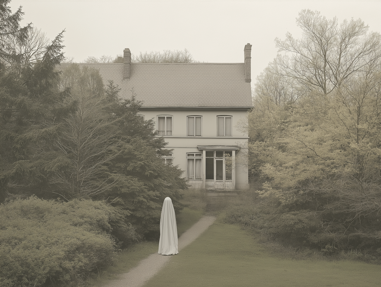 Eerie scene of a ghostly figure in white approaching an old house surrounded by dense trees, creating a mysterious atmosphere.