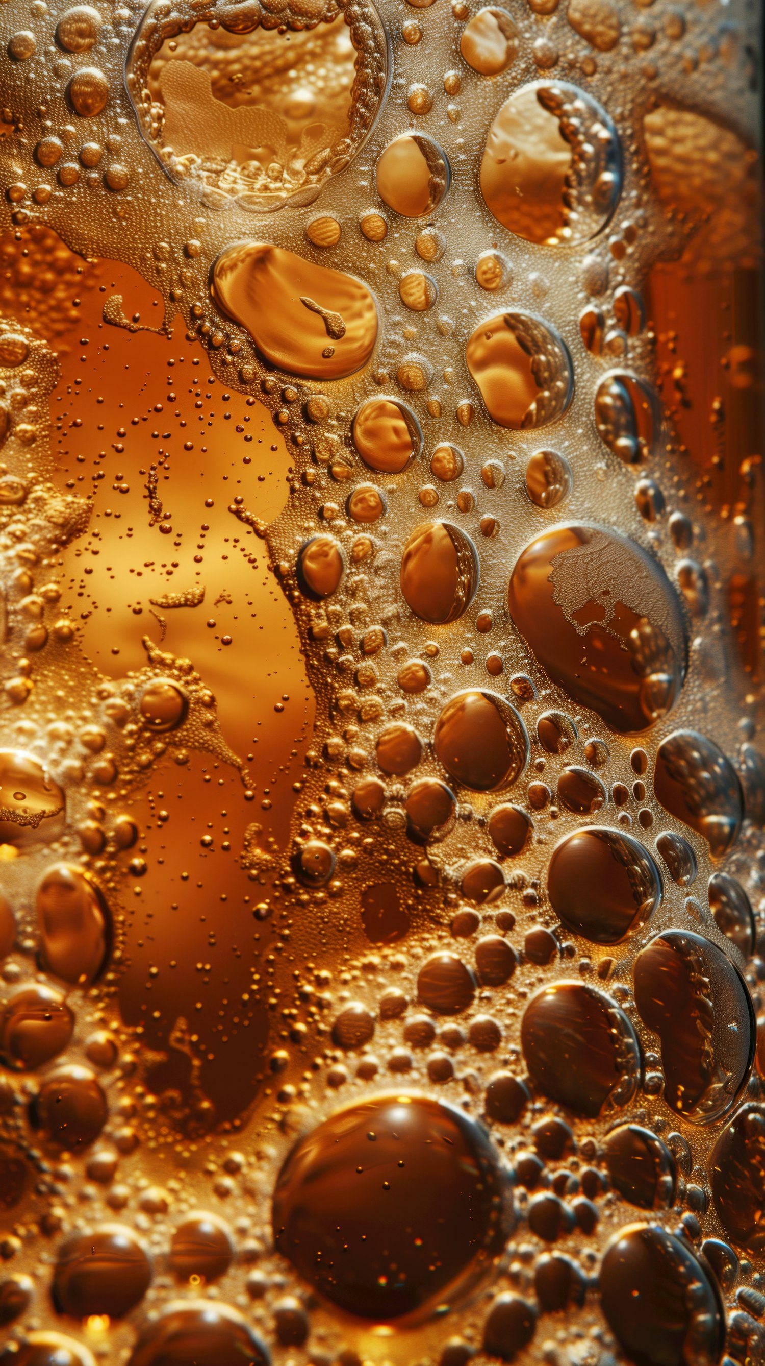 Close-up of carbonated beverage with bubbles in amber liquid, highlighting effervescence and texture.