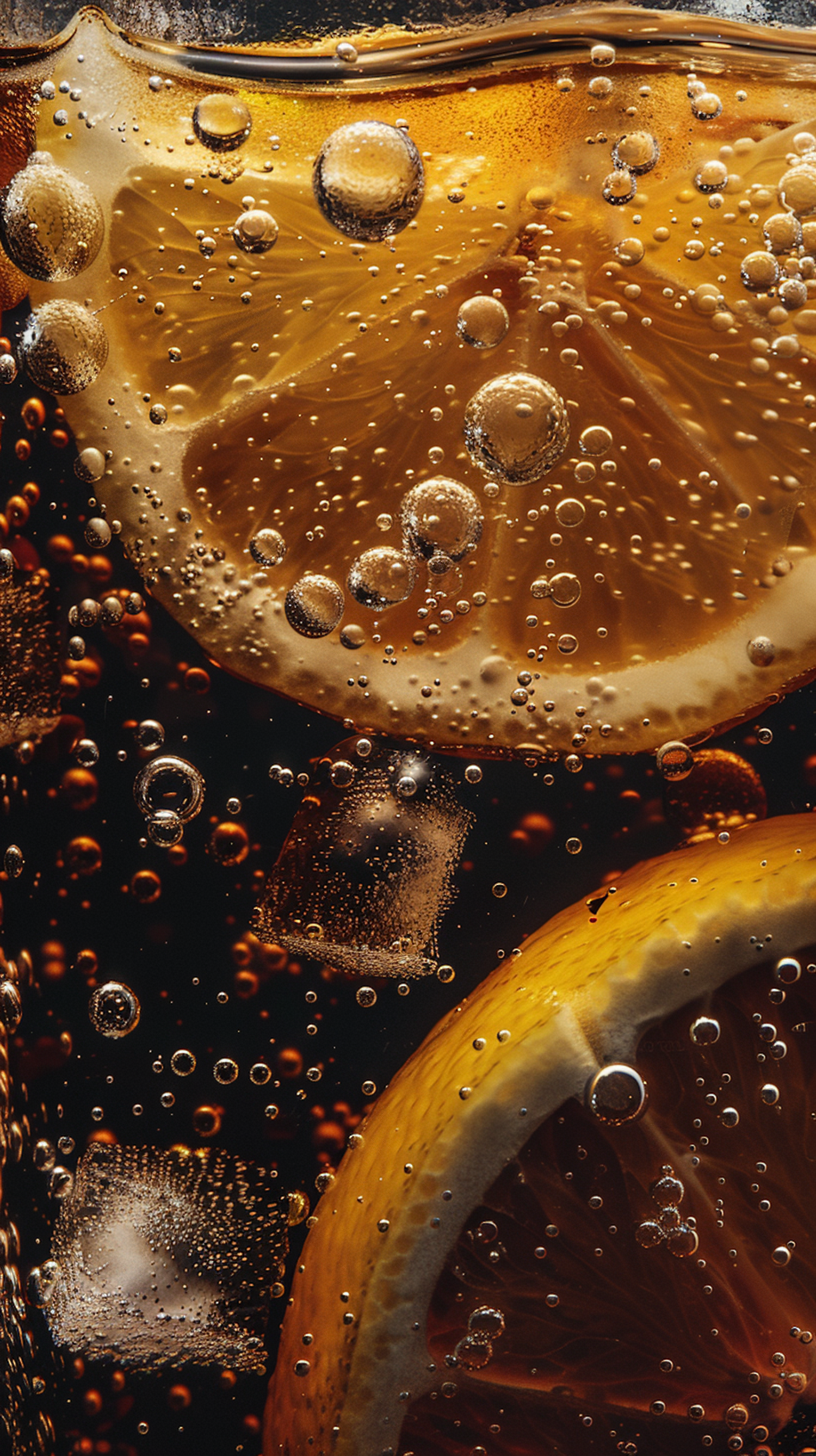 Close-up of a fizzy drink with lemon slices and ice cubes, showcasing vibrant bubbles and refreshing textures.