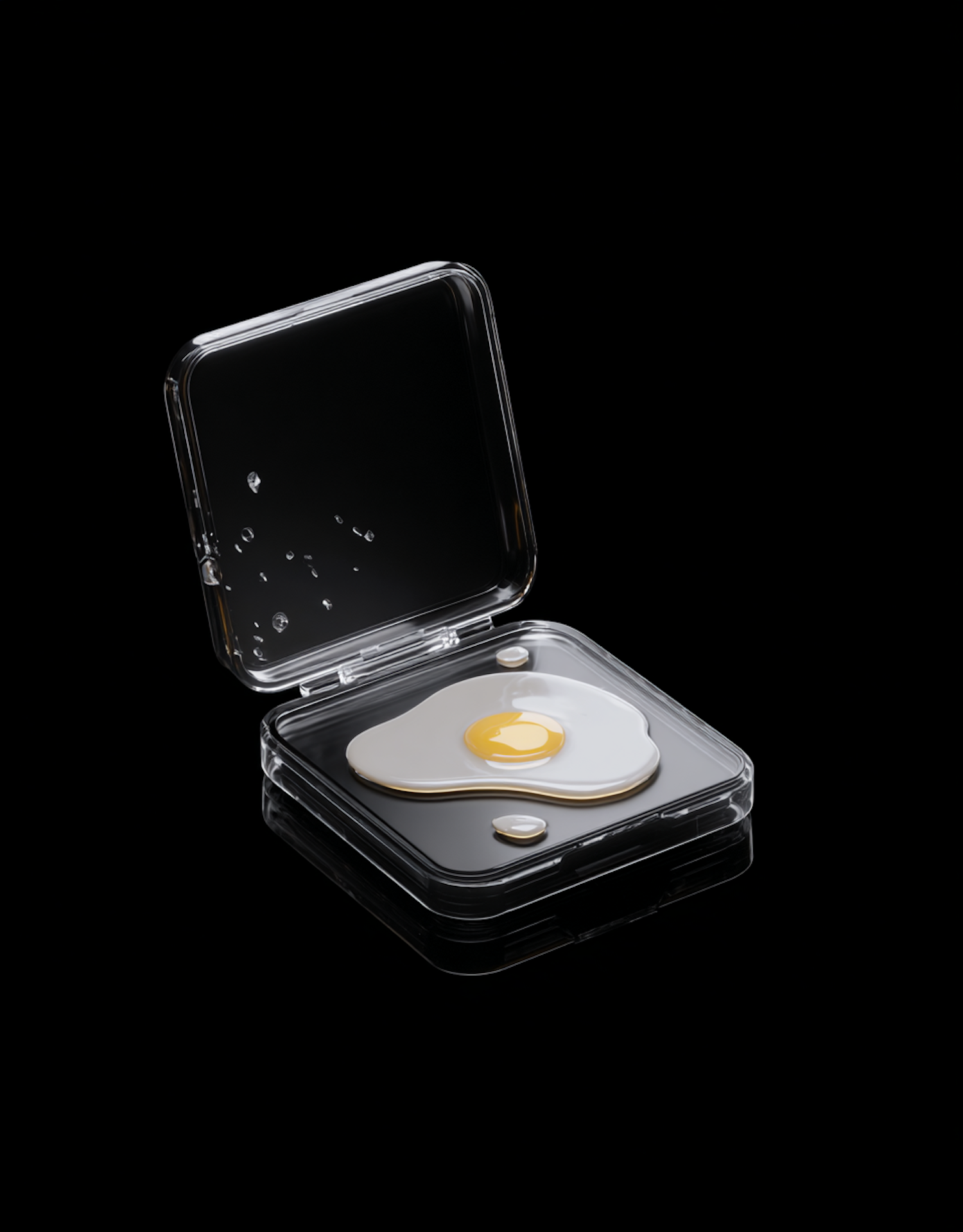 A transparent compact case with a fried egg design inside, set against a black background for a modern and quirky aesthetic.