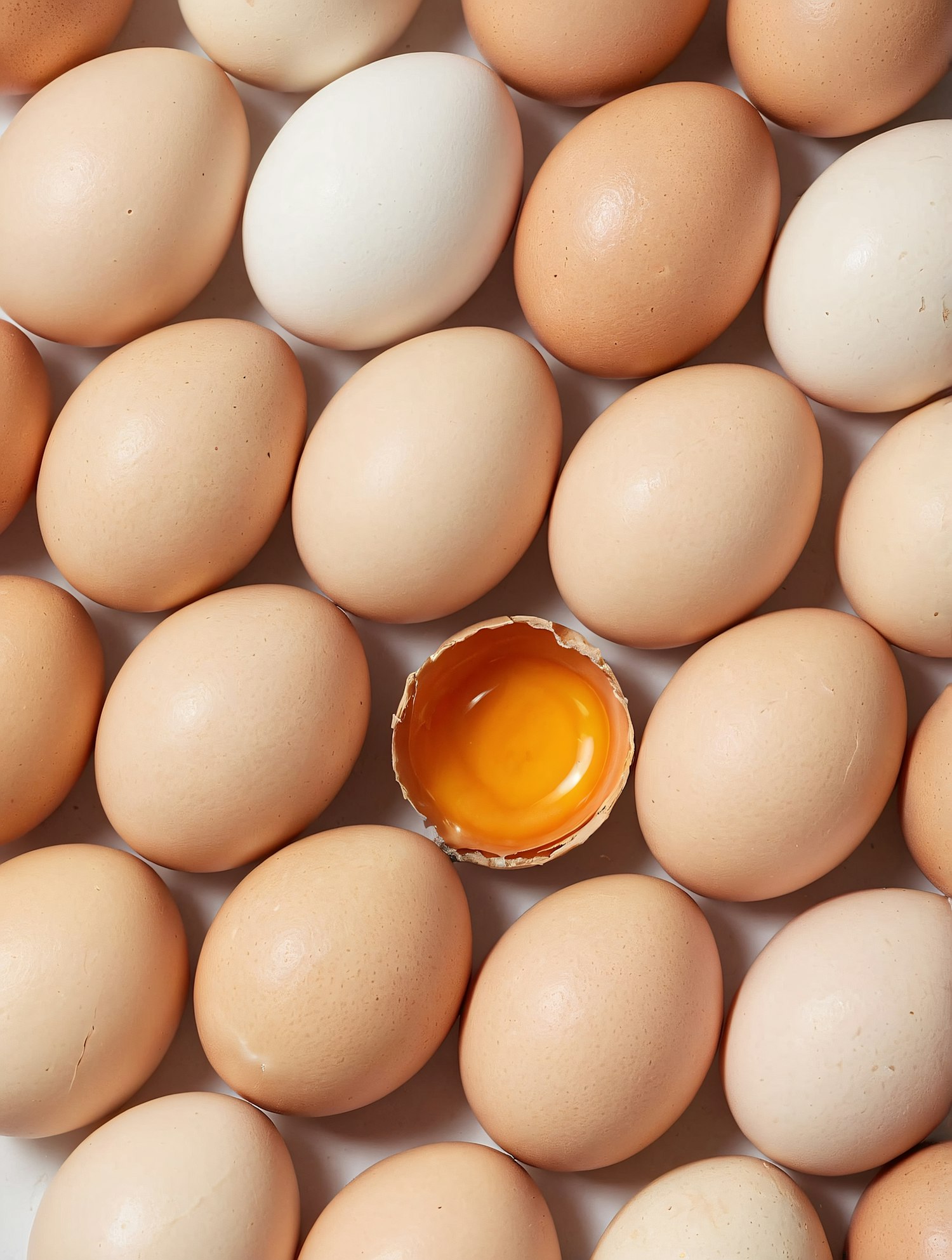 A collection of brown eggs with one white egg and a cracked one revealing a bright yellow yolk, arranged in a neat pattern.