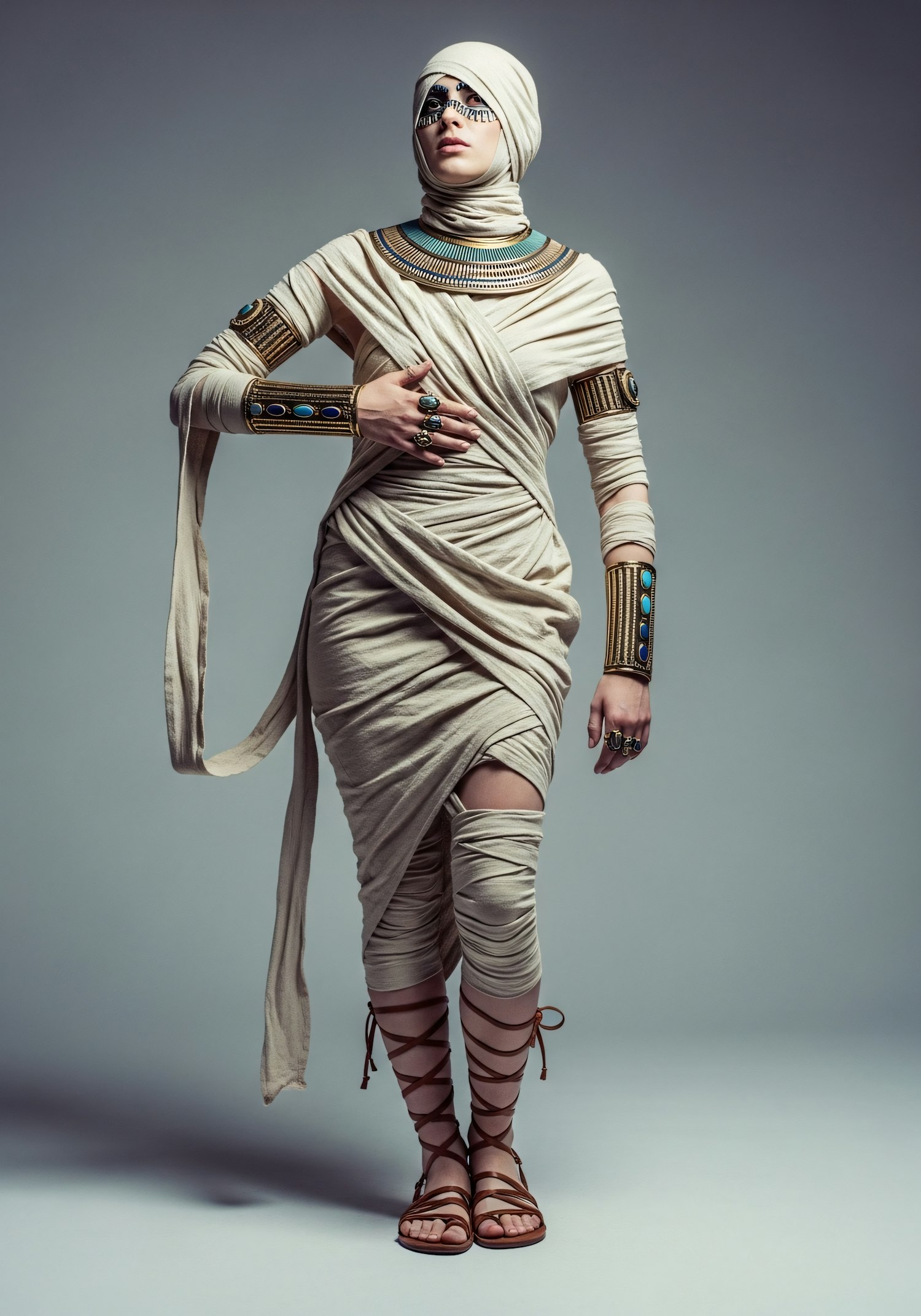 A person in a beige, draped outfit with Egyptian-inspired jewelry and accessories, standing against a neutral background.