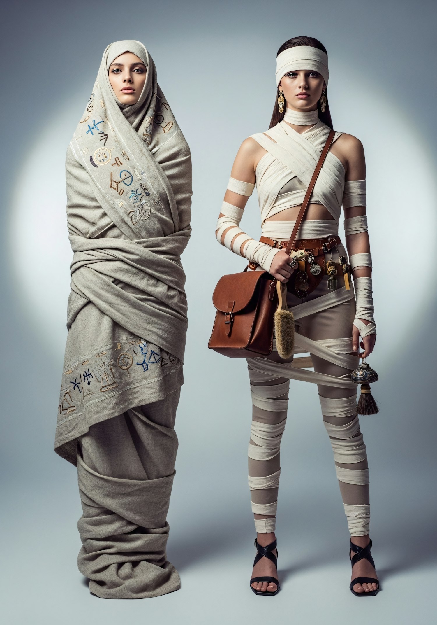 Two individuals in Egyptian-inspired attire, one wrapped in hieroglyphic fabric and the other in modern mummy-style bandages, in a studio setting.