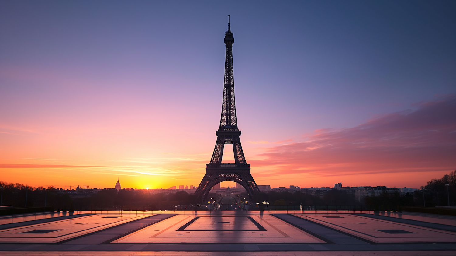 Eiffel Tower silhouette at sunrise with vibrant sky and empty plaza, capturing serene Parisian beauty.