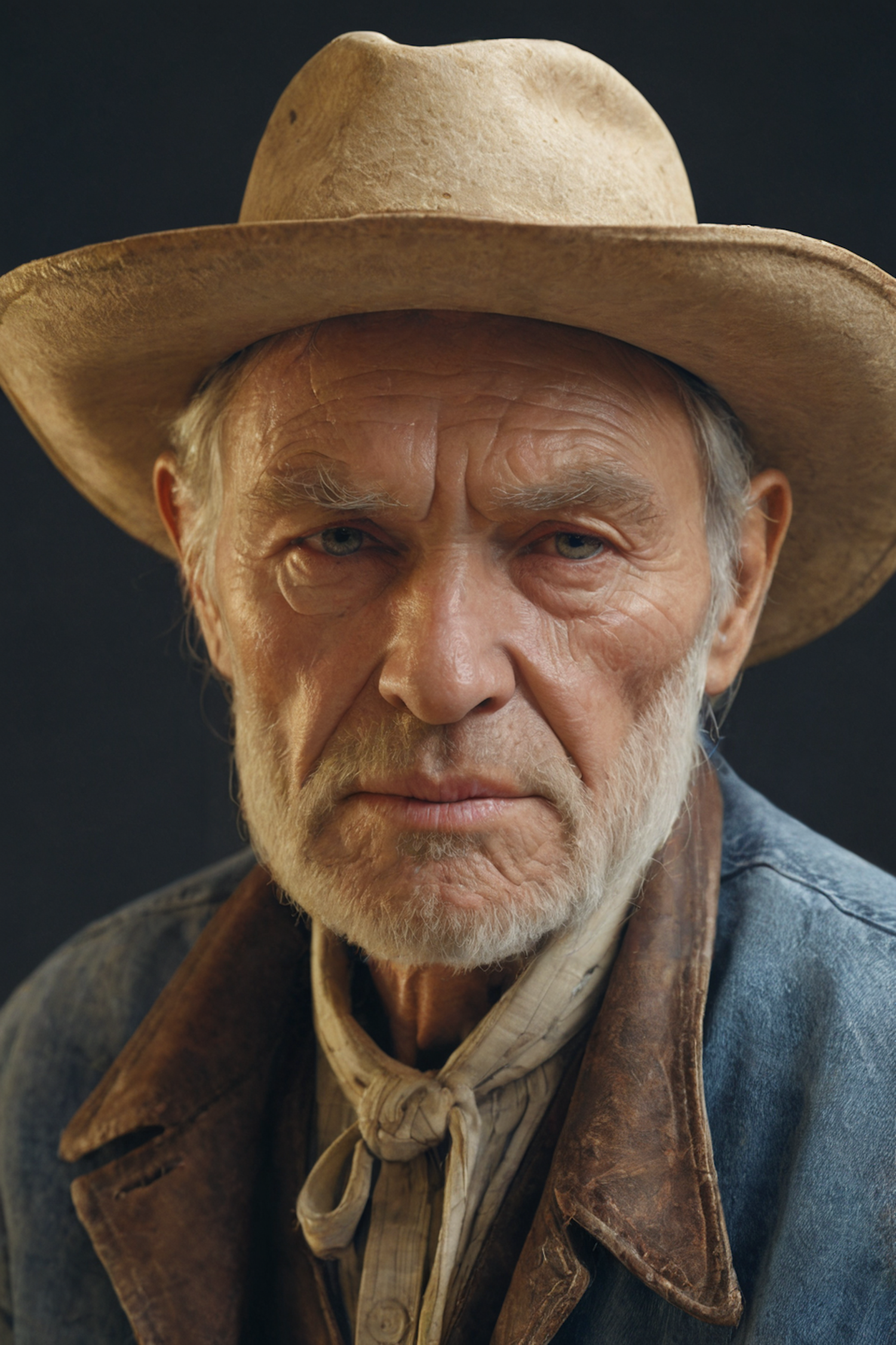 Close-up of an elderly man wearing a cowboy hat and denim jacket, showcasing his rugged appearance against a dark background.