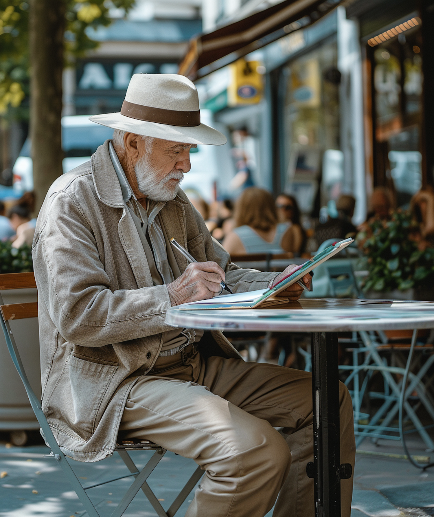 Elderly man sketching at an outdoor café, wearing a beige jacket and hat, surrounded by a lively street scene.
