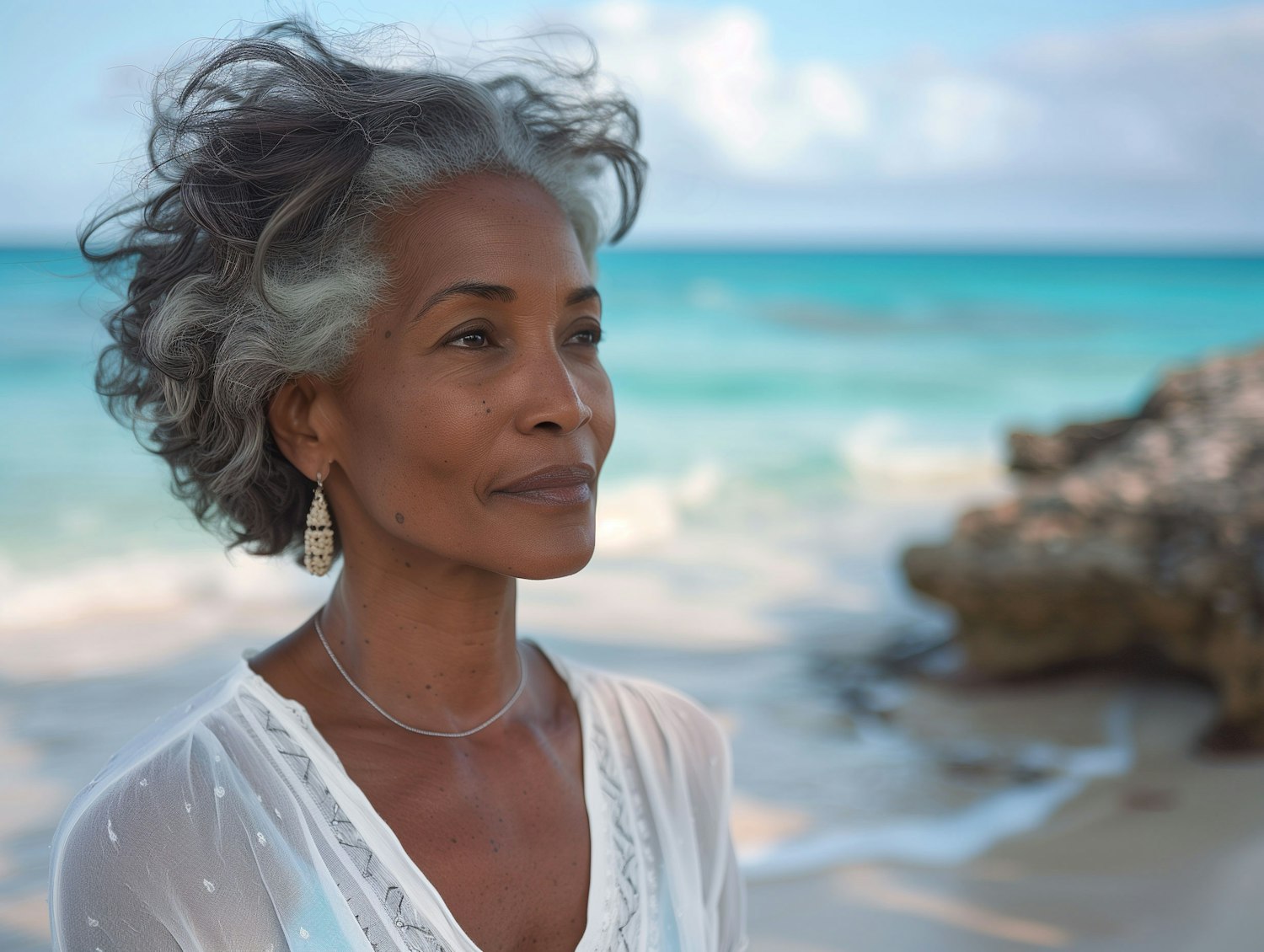 Mature woman with gray hair gazes thoughtfully on a serene beach, wearing a white blouse and elegant earrings.