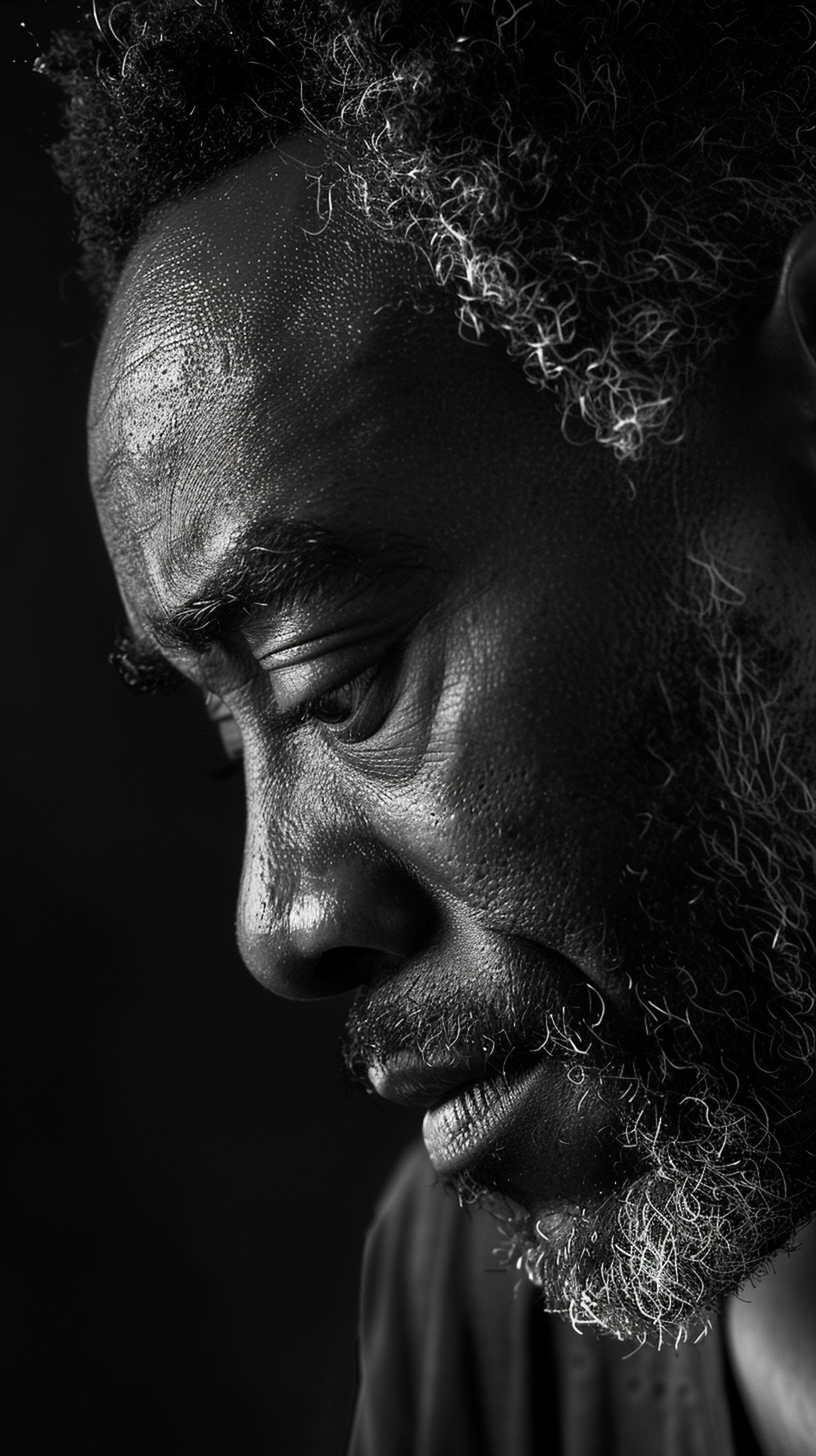 Black and white portrait of an older man with textured skin and gray hair, exuding a contemplative and emotional expression.