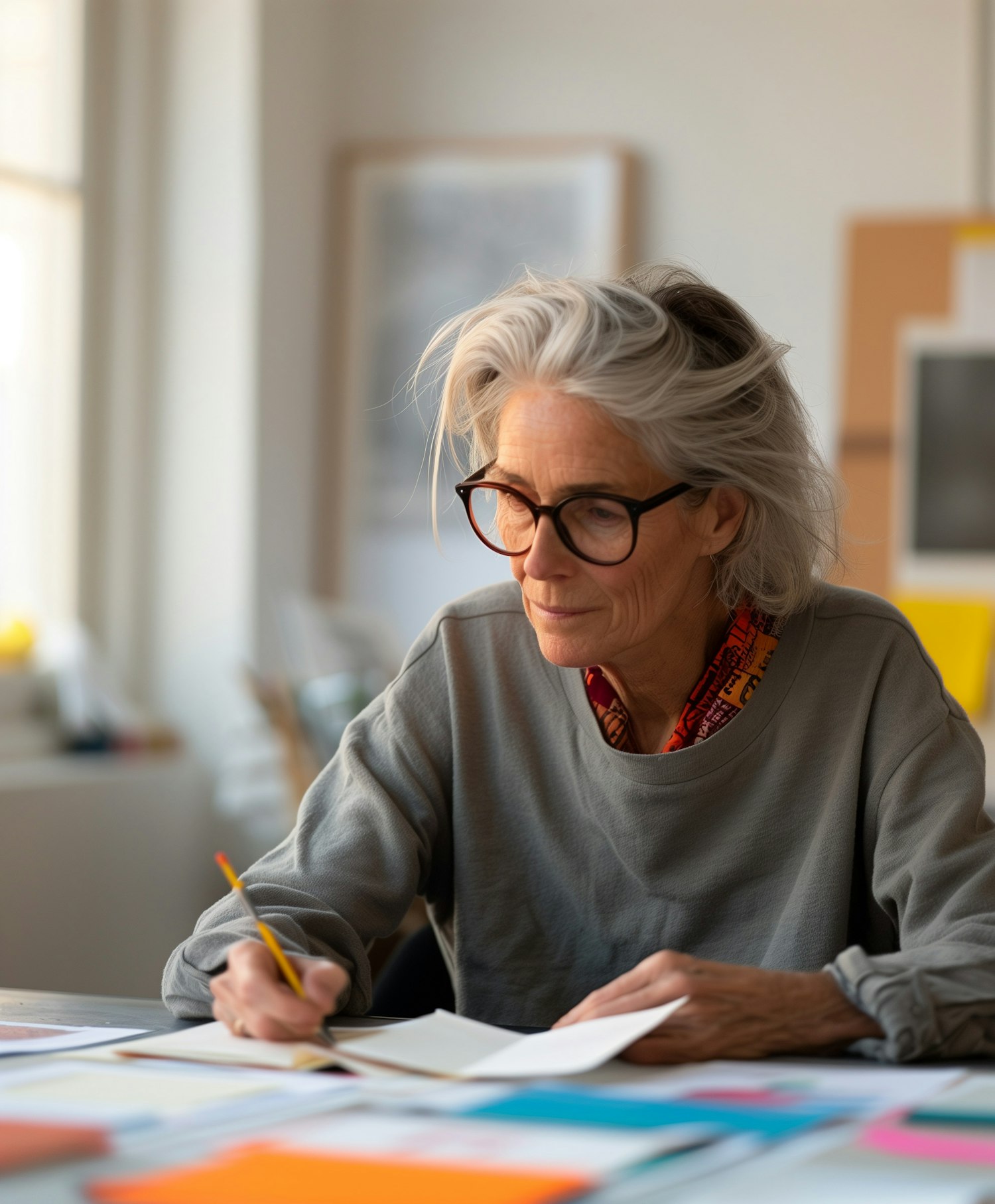 Elderly woman with gray hair and glasses writing in a notebook, surrounded by colorful papers in a sunlit room.