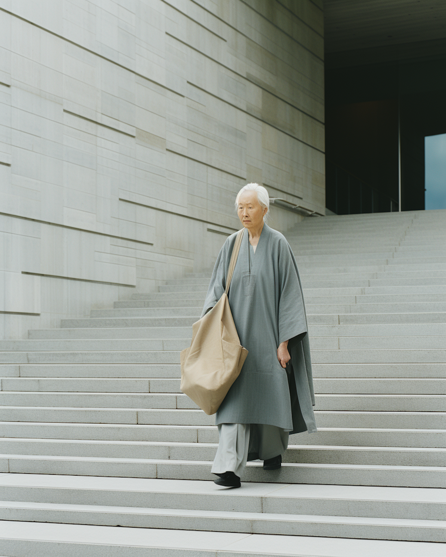 Elderly man in gray robe descends modern stone steps, carrying a large beige bag. Minimalist architecture enhances serene atmosphere.