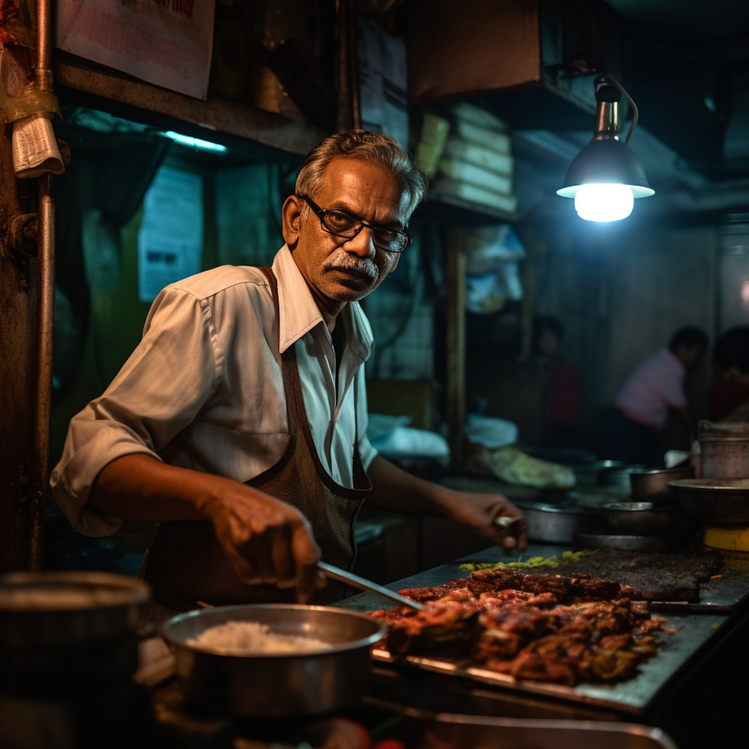 A focused street food vendor grills skewers under warm lighting, creating an inviting and authentic culinary scene.