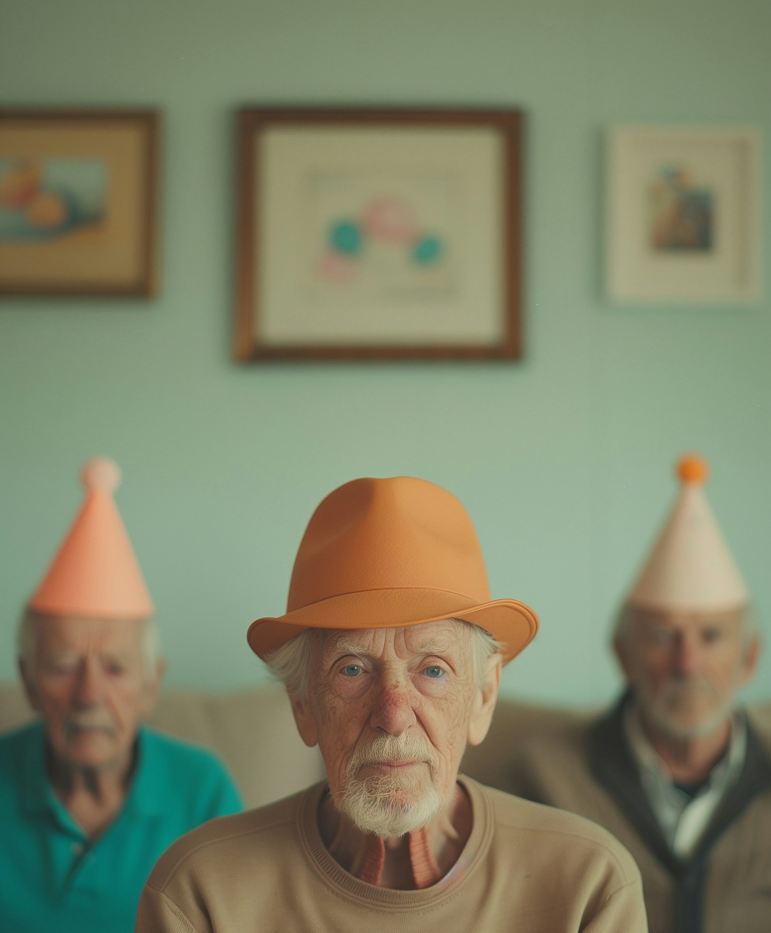 Elderly man in orange hat with two others in party hats, set against a pastel wall with framed art. Calm and contemplative mood.
