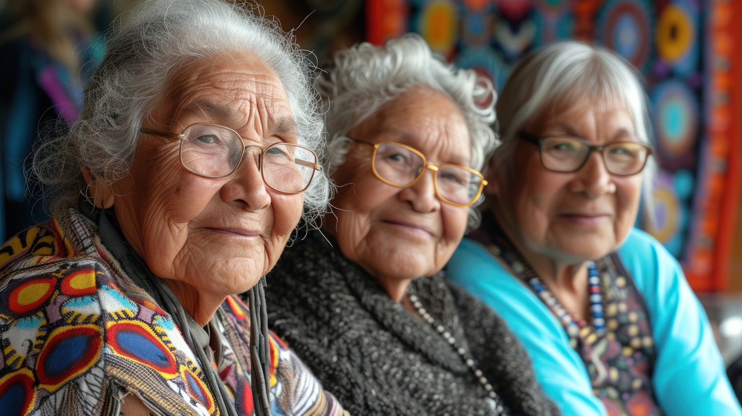 Three elderly women with glasses and white hair, wearing colorful clothing, sit together against a vibrant tapestry background.
