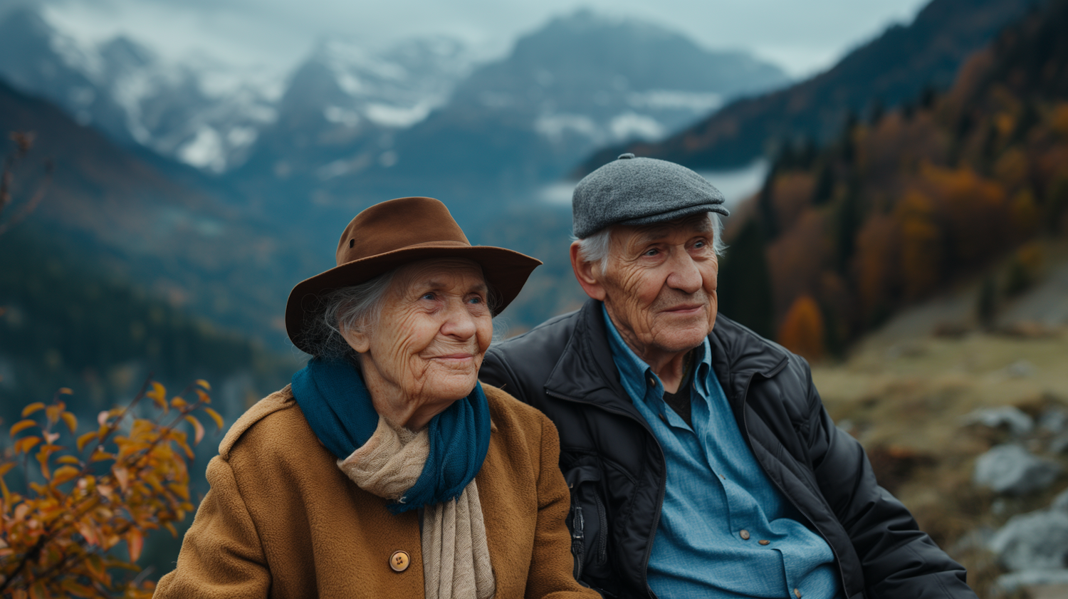 Elderly couple enjoying a serene mountain view, dressed warmly in hats and scarves, with autumn foliage in the background.