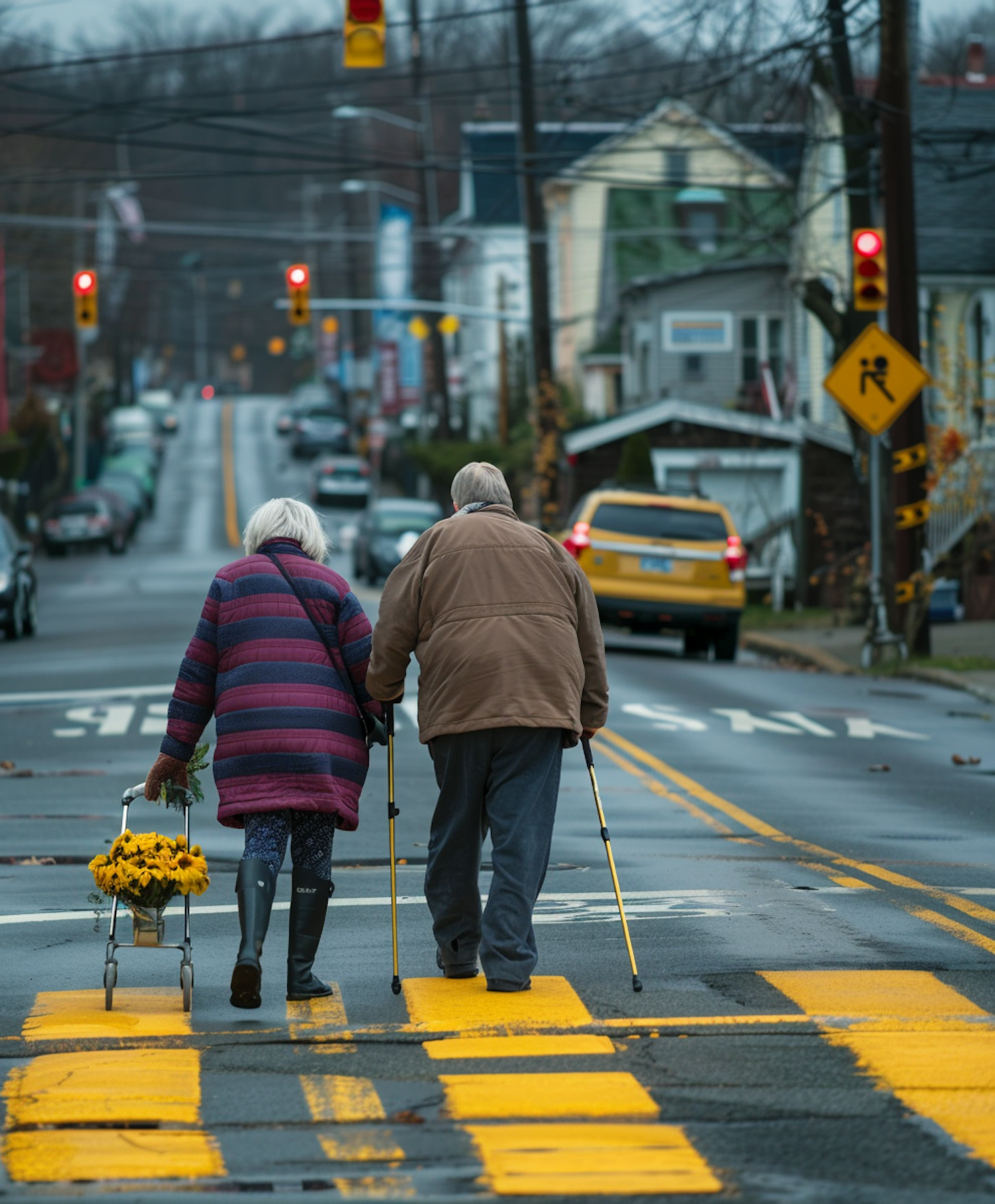 Elderly couple crossing a street with a walker and cane, carrying yellow flowers on a rainy day. Suburban backdrop with traffic lights.