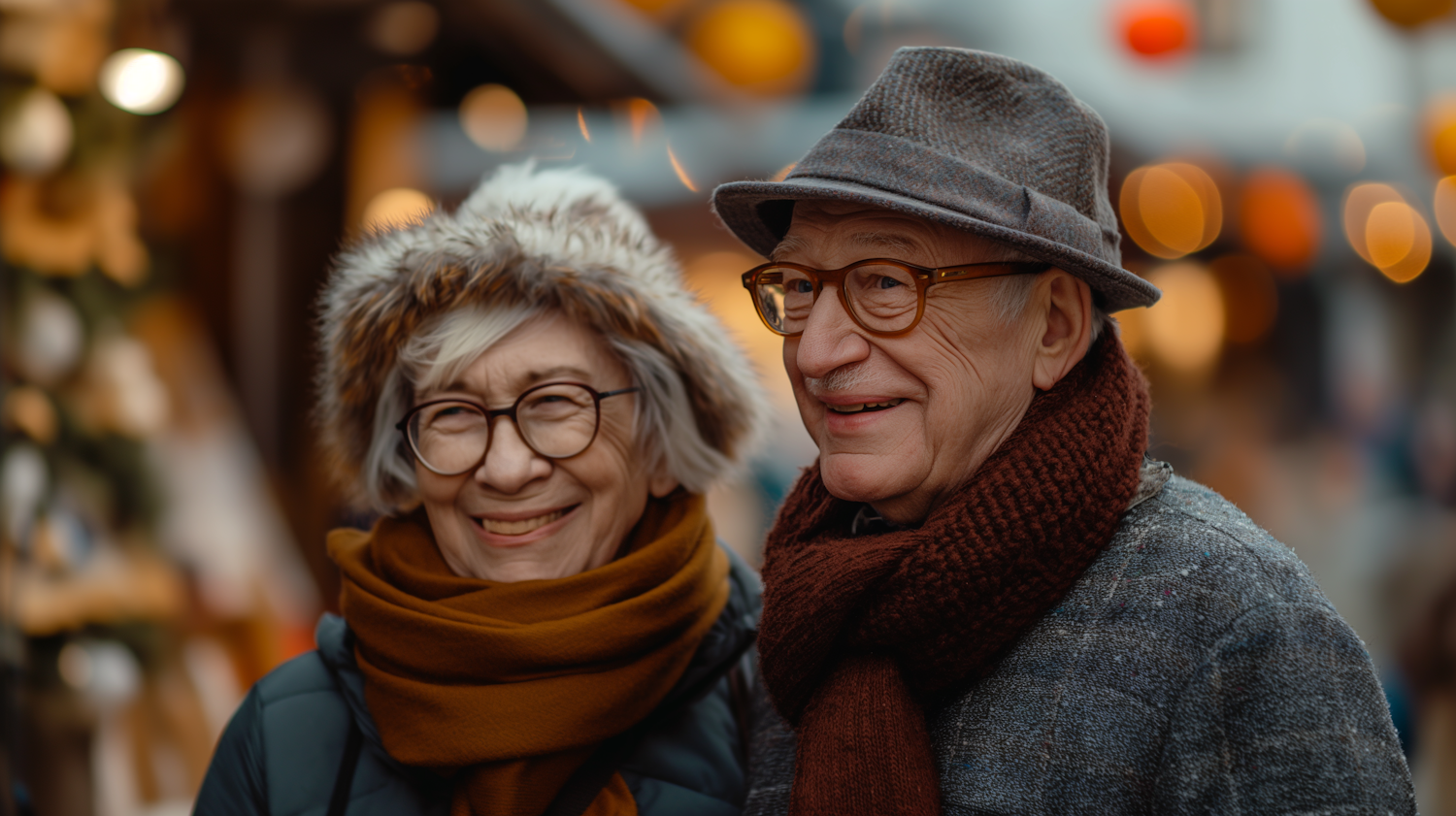 Elderly couple smiling warmly, wearing winter attire with glasses, in a festive setting with blurred bokeh lights.