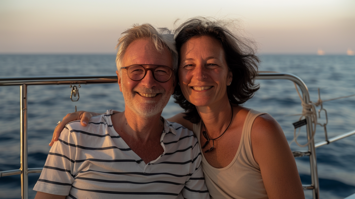 Smiling couple on a boat at sea during sunset, enjoying a peaceful moment together.