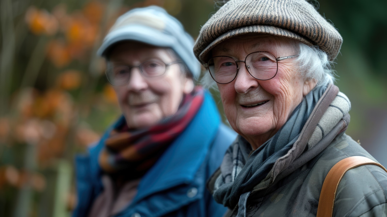 Two elderly individuals in warm attire, smiling outdoors in an autumn setting, exuding warmth and companionship.
