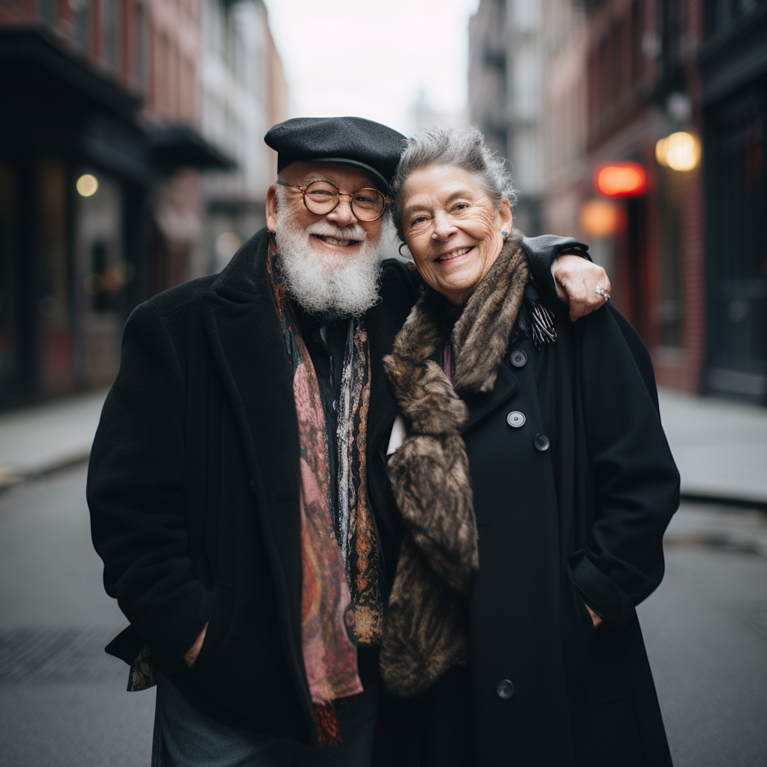 Elderly couple smiling warmly on a city street, dressed elegantly in black coats and scarves, exuding warmth and companionship.