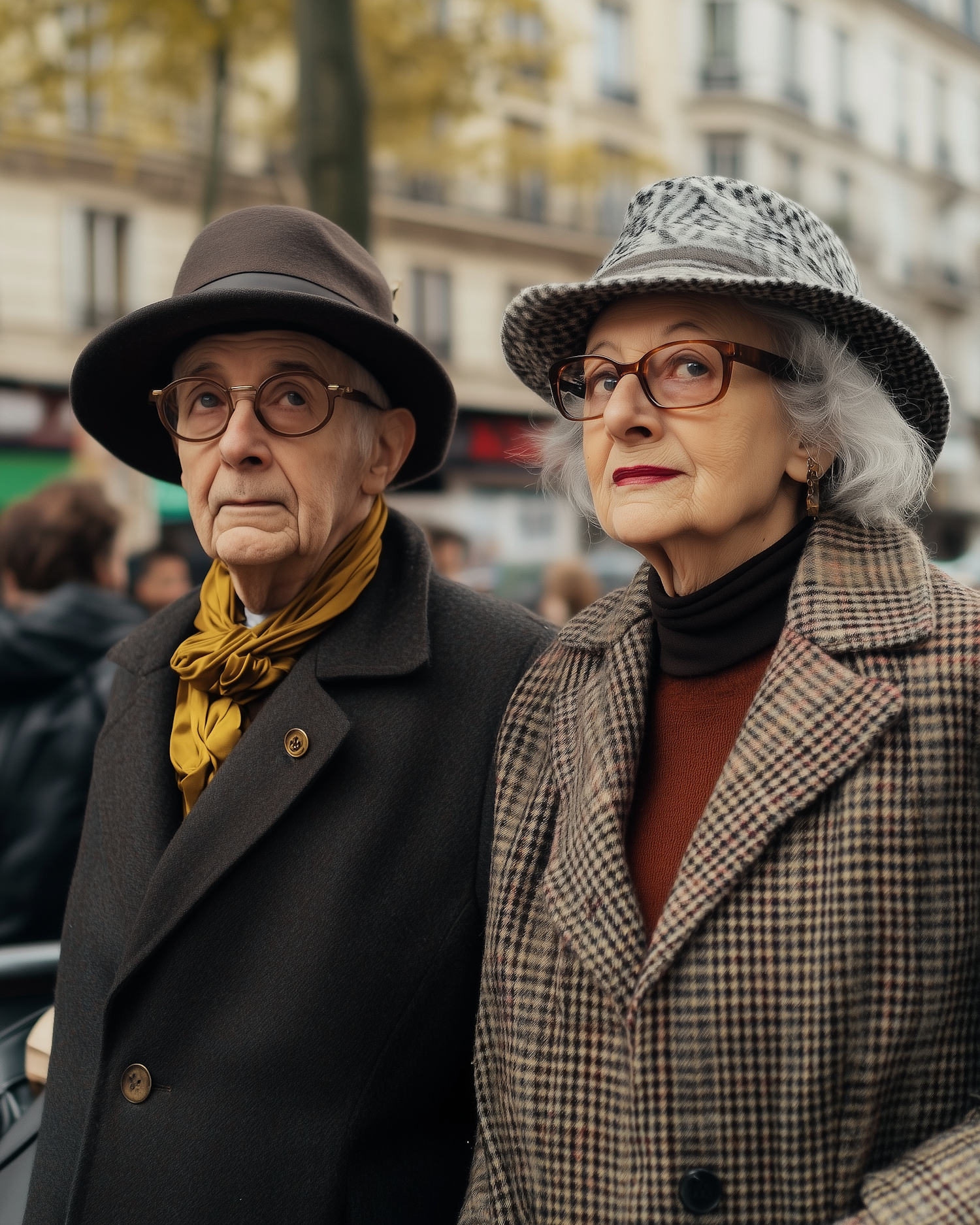 Elegant elderly couple in stylish coats and hats, standing together on a city street. Timeless fashion and poised expressions.