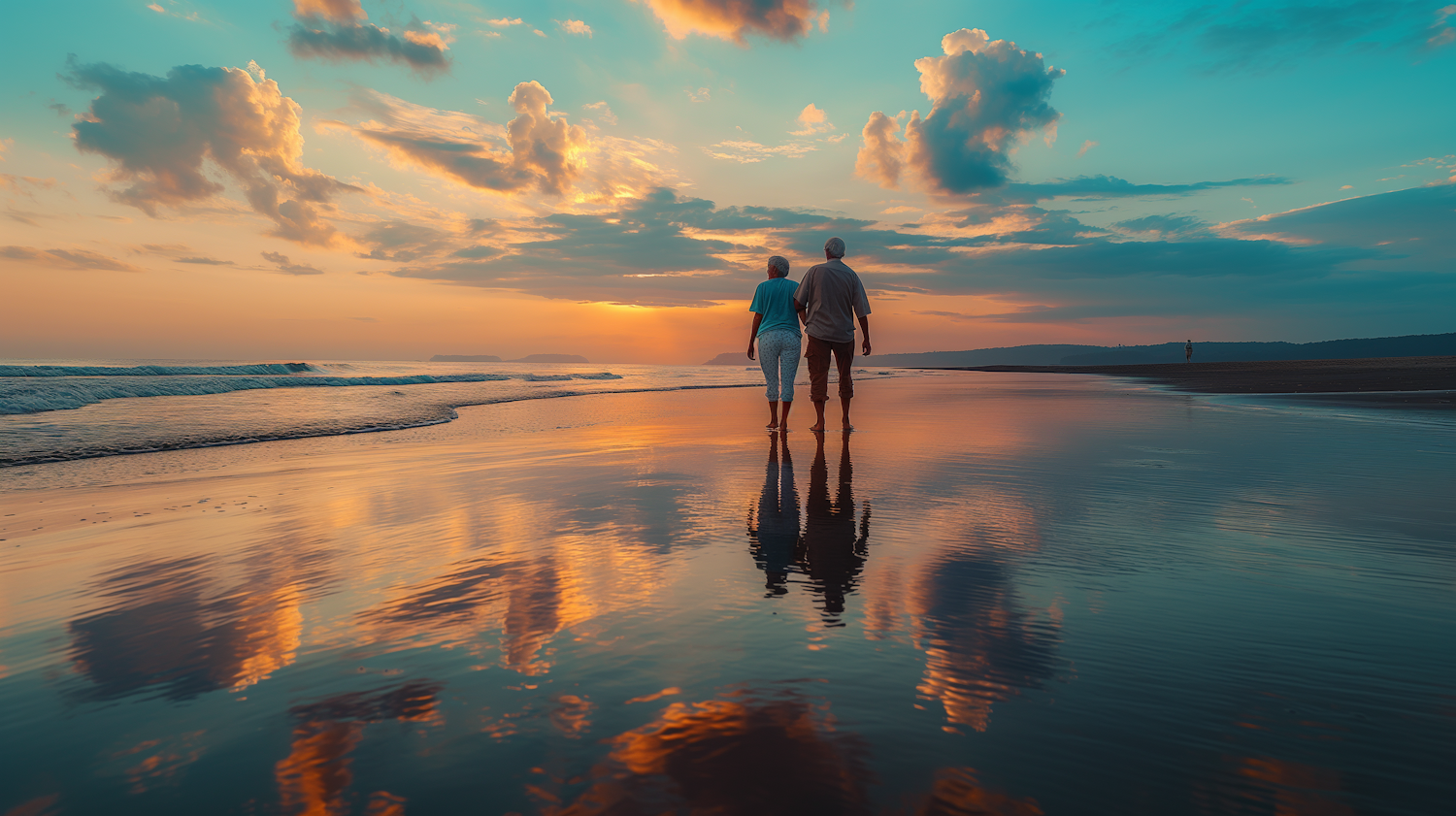 A couple walks hand in hand on a serene beach at sunset, with vibrant skies and reflections on the wet sand creating a tranquil scene.