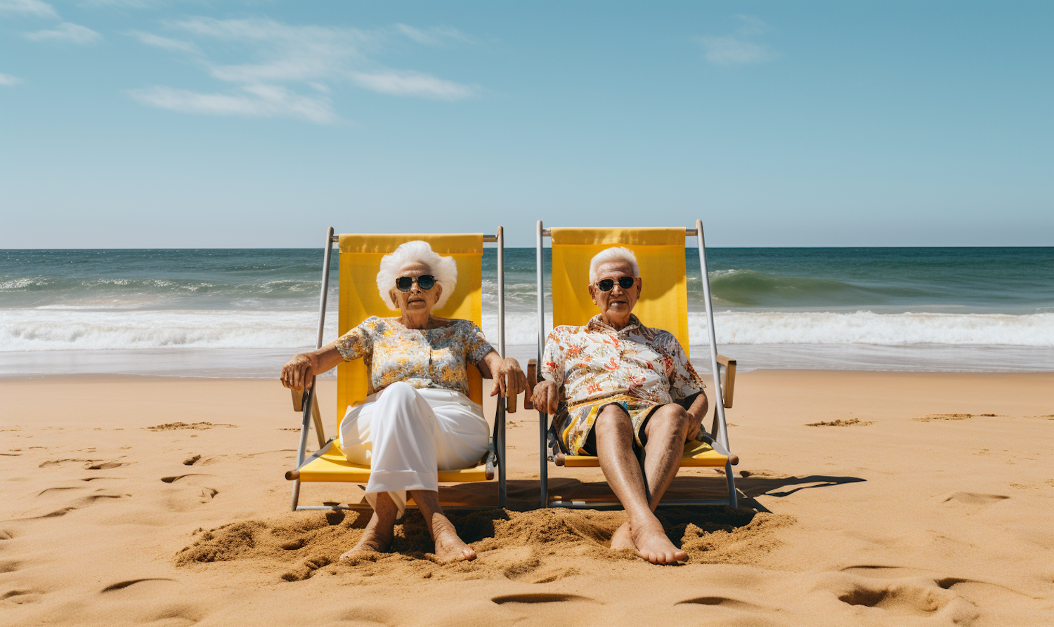 Elderly couple enjoying a sunny day at the beach, seated in yellow deck chairs with the ocean in the background.