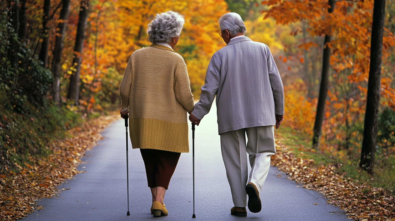 Elderly couple walking hand in hand on a scenic autumn path, surrounded by vibrant fall foliage.