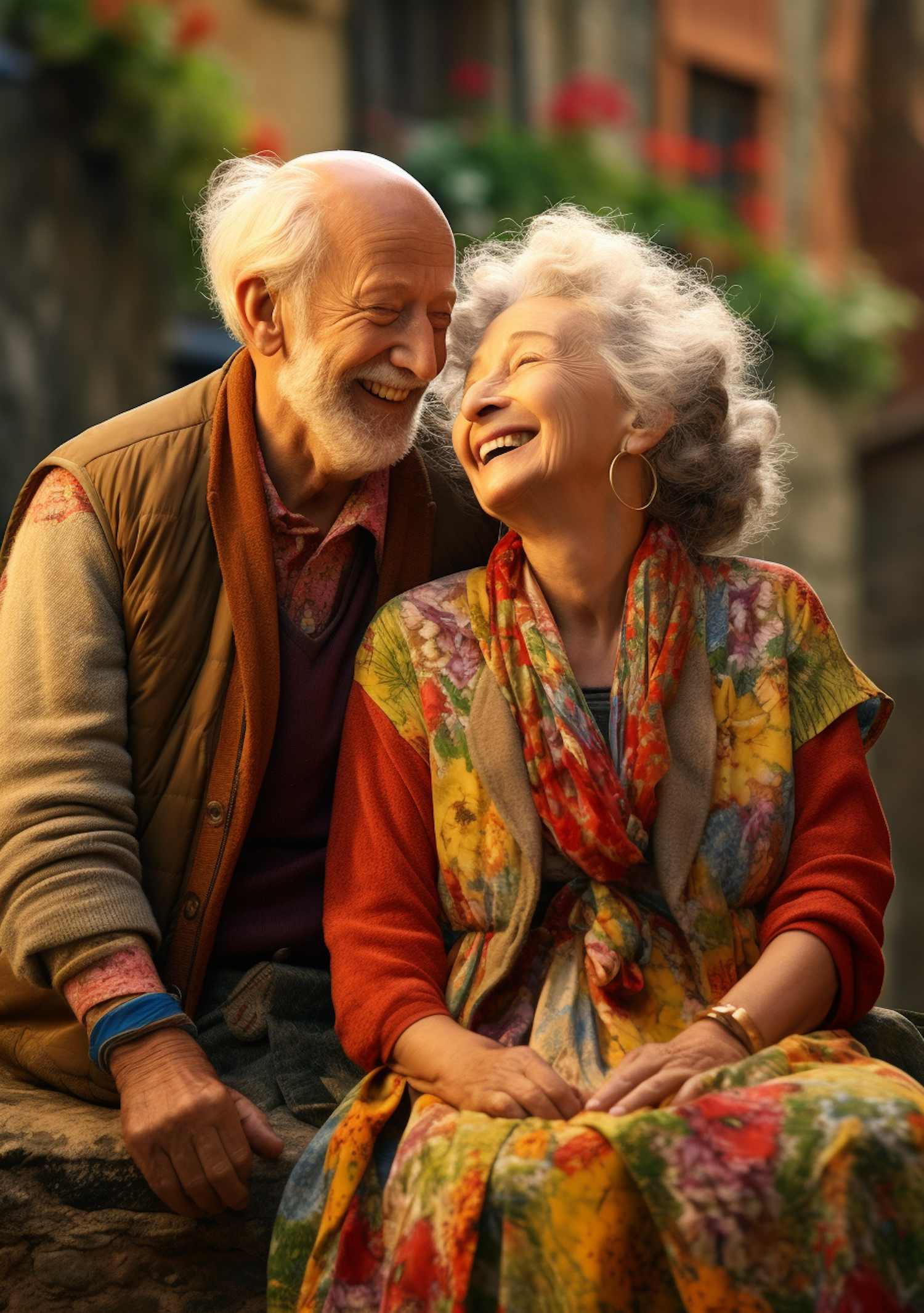 Joyful elderly couple sharing a laugh outdoors, dressed in colorful attire, with a warm and loving connection.