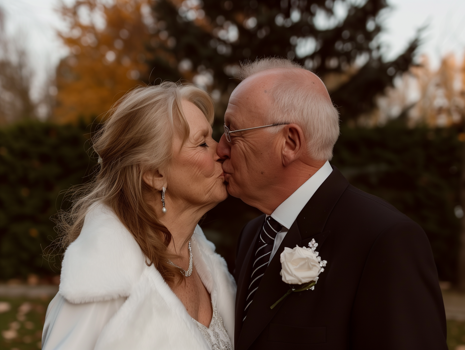 Elderly couple shares a loving kiss outdoors, dressed elegantly with autumn foliage in the background.