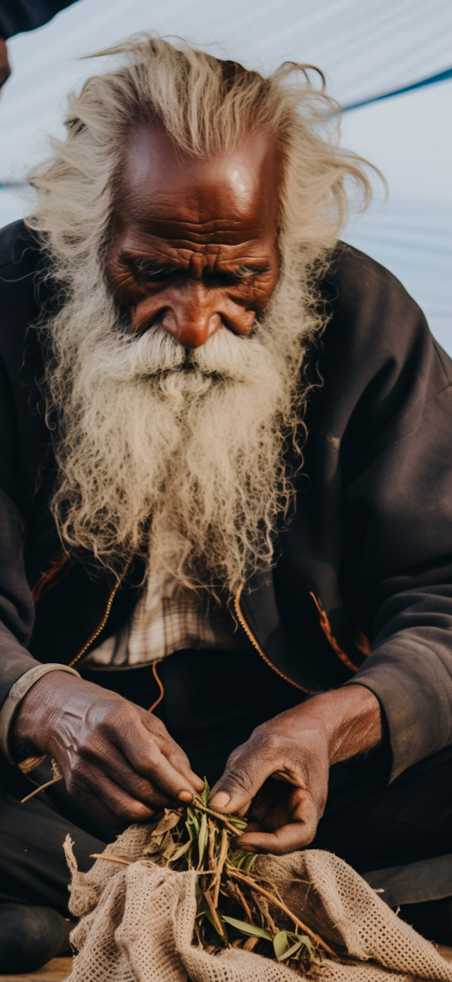 Elderly man with white beard sorting leaves, wearing dark jacket. Focused expression, hands handling leaves on burlap sack.