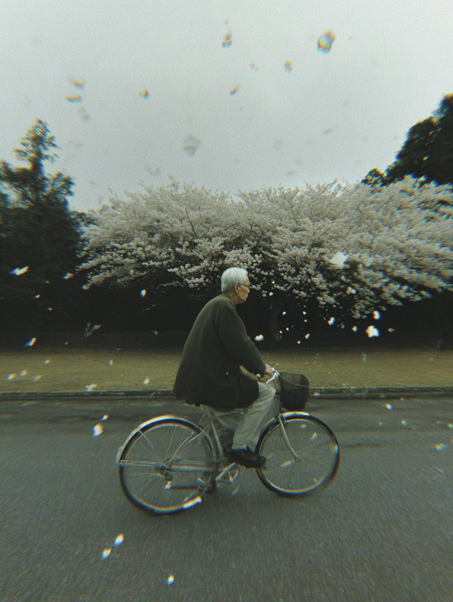A serene scene of an elderly person cycling under blooming cherry blossoms, with petals gently falling in an overcast setting.