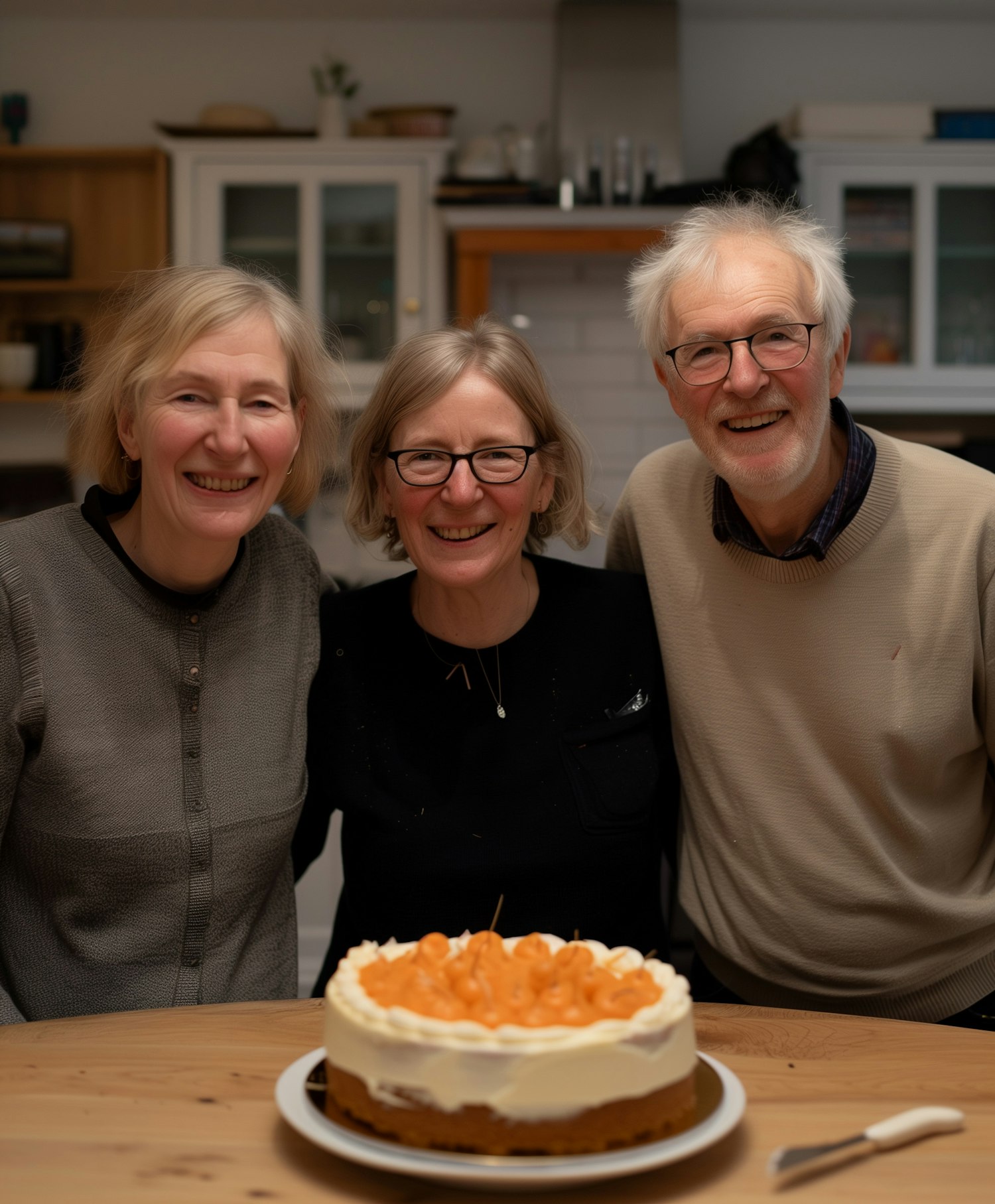 Three elderly friends smiling around a table with a cake, in a cozy kitchen setting.