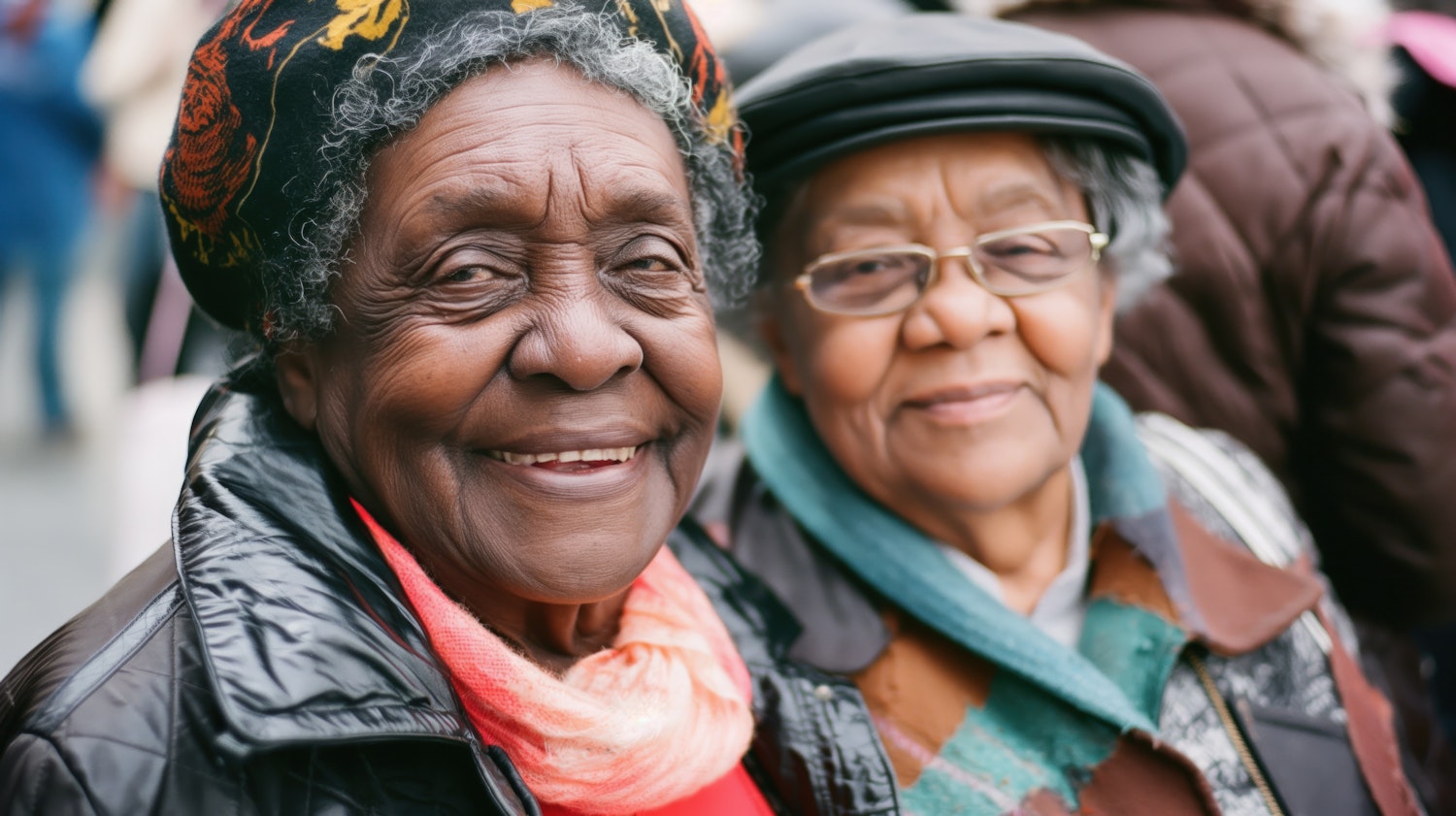 Two elderly women smiling warmly, wearing colorful scarves and jackets, capturing a moment of joy and friendship.
