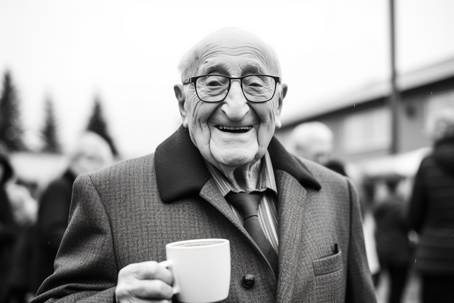 Elderly man with glasses and a warm smile holds a coffee cup outdoors, wearing a dark overcoat and tie. Black and white photo.