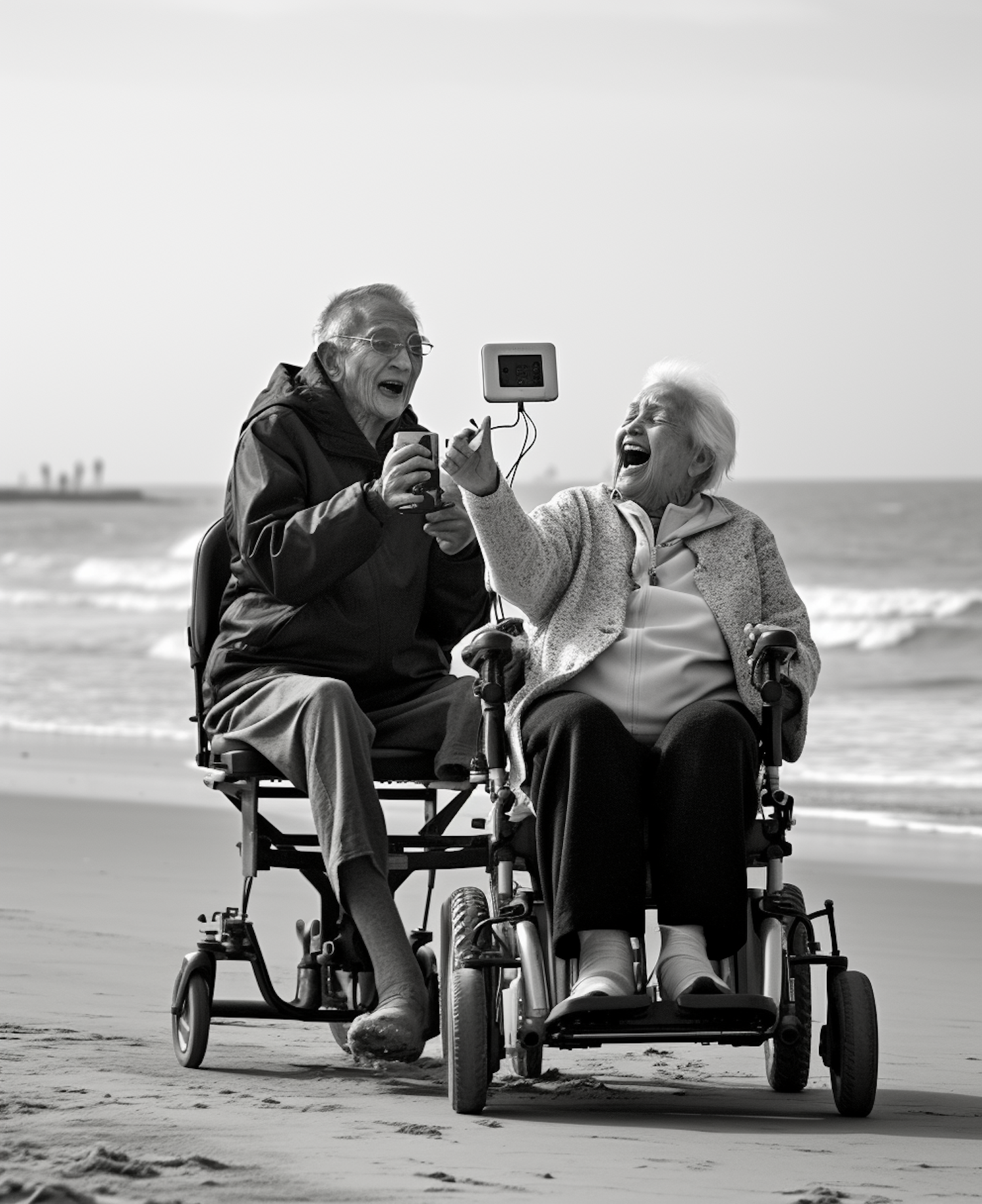 Elderly couple in wheelchairs joyfully capturing a moment on a beach, with ocean waves in the background.