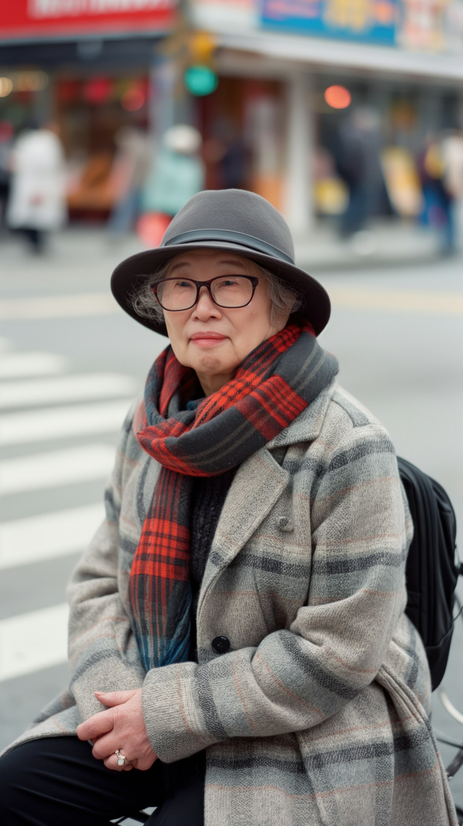 Elderly woman in a gray hat and plaid coat sits on a city bench, exuding calmness amidst a bustling urban backdrop.