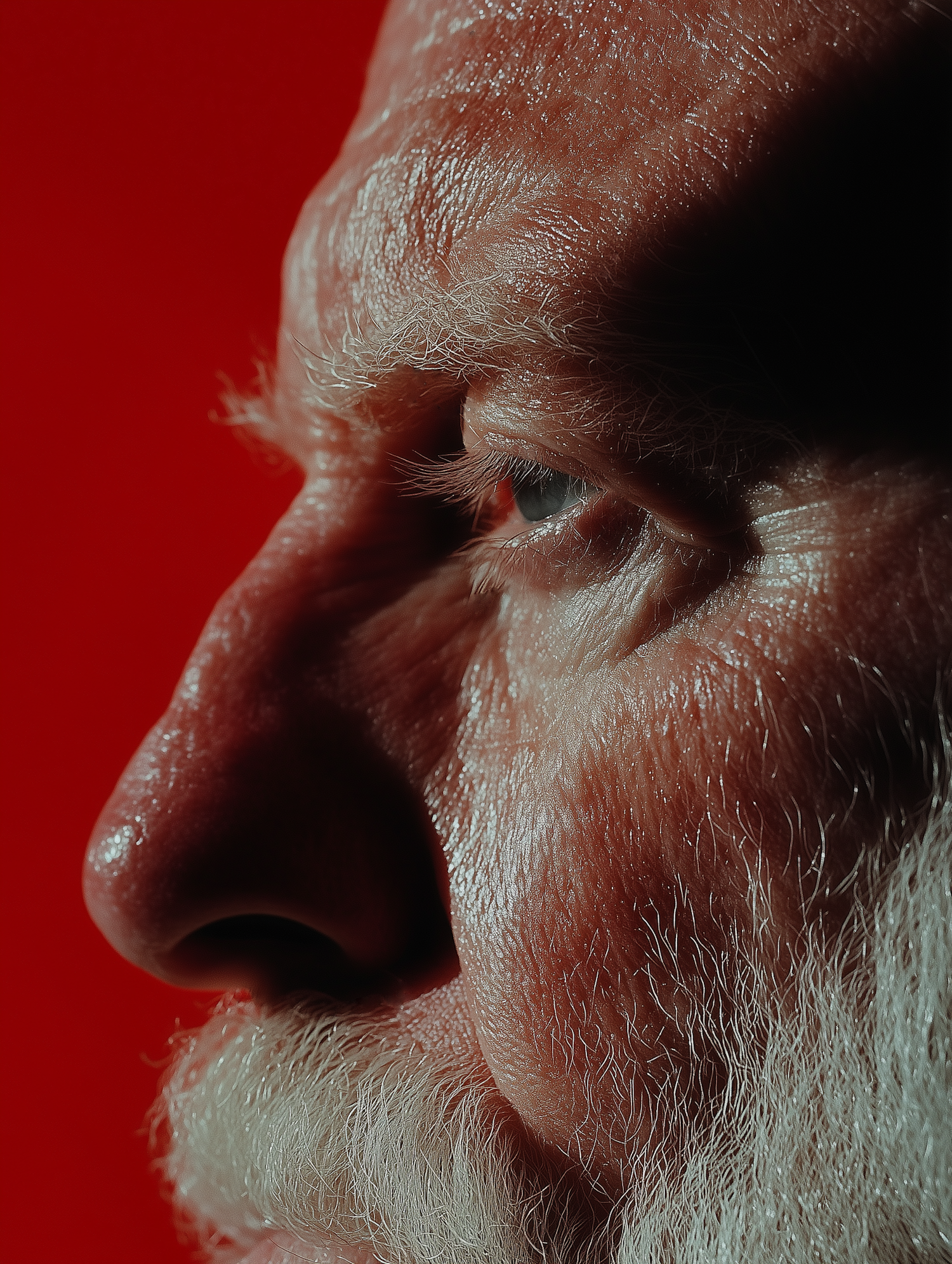 Close-up of an elderly man's profile with a white beard against a vibrant red background, highlighting facial details and expression.