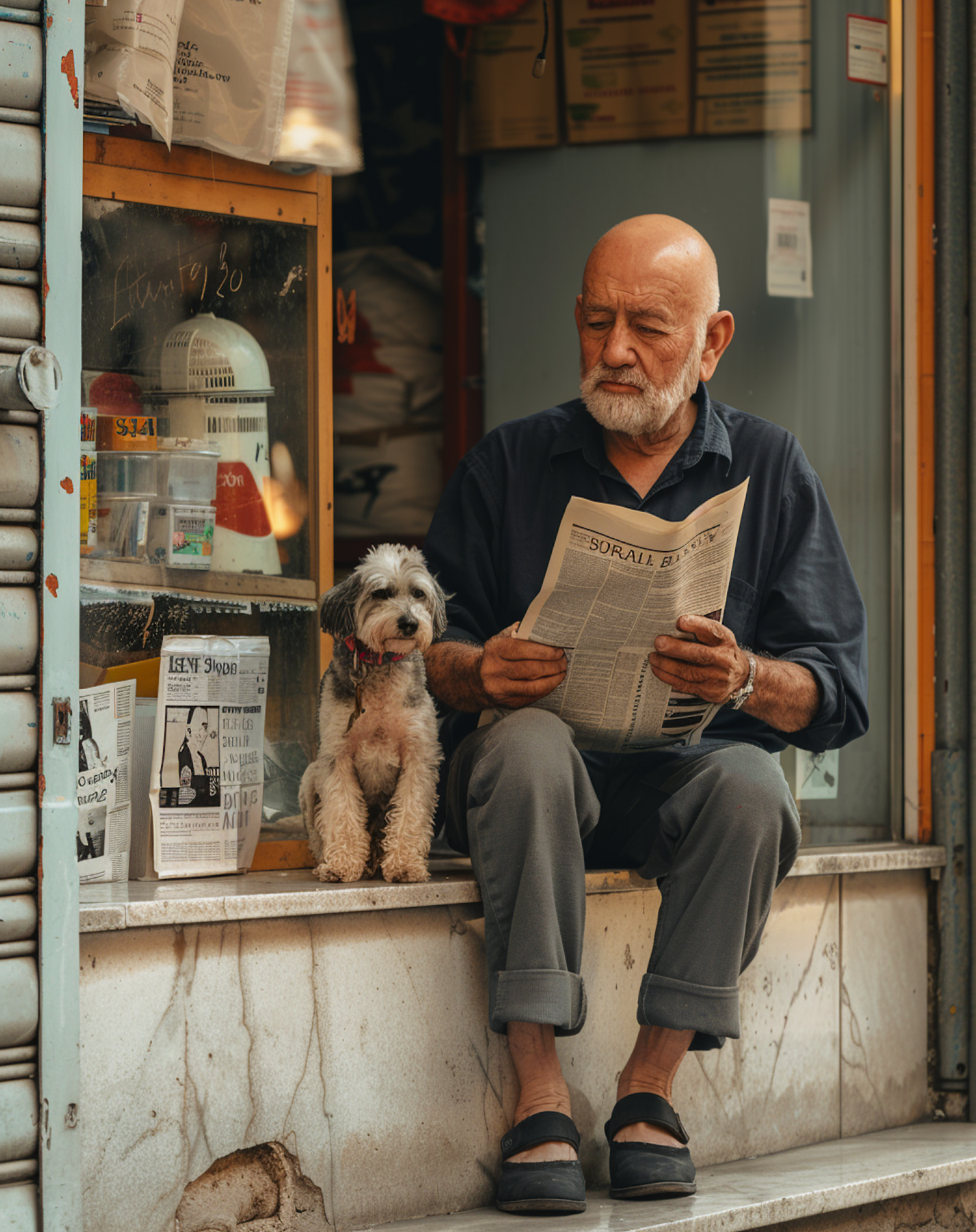 Elderly man reading a newspaper with his dog by his side, sitting on a shop step. Calm and serene street scene.