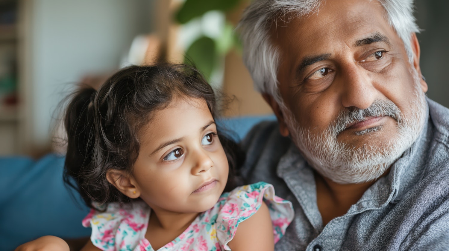 Elderly man and young girl share a tender moment, gazing in the same direction. Warm expressions and colorful attire create a cozy scene.
